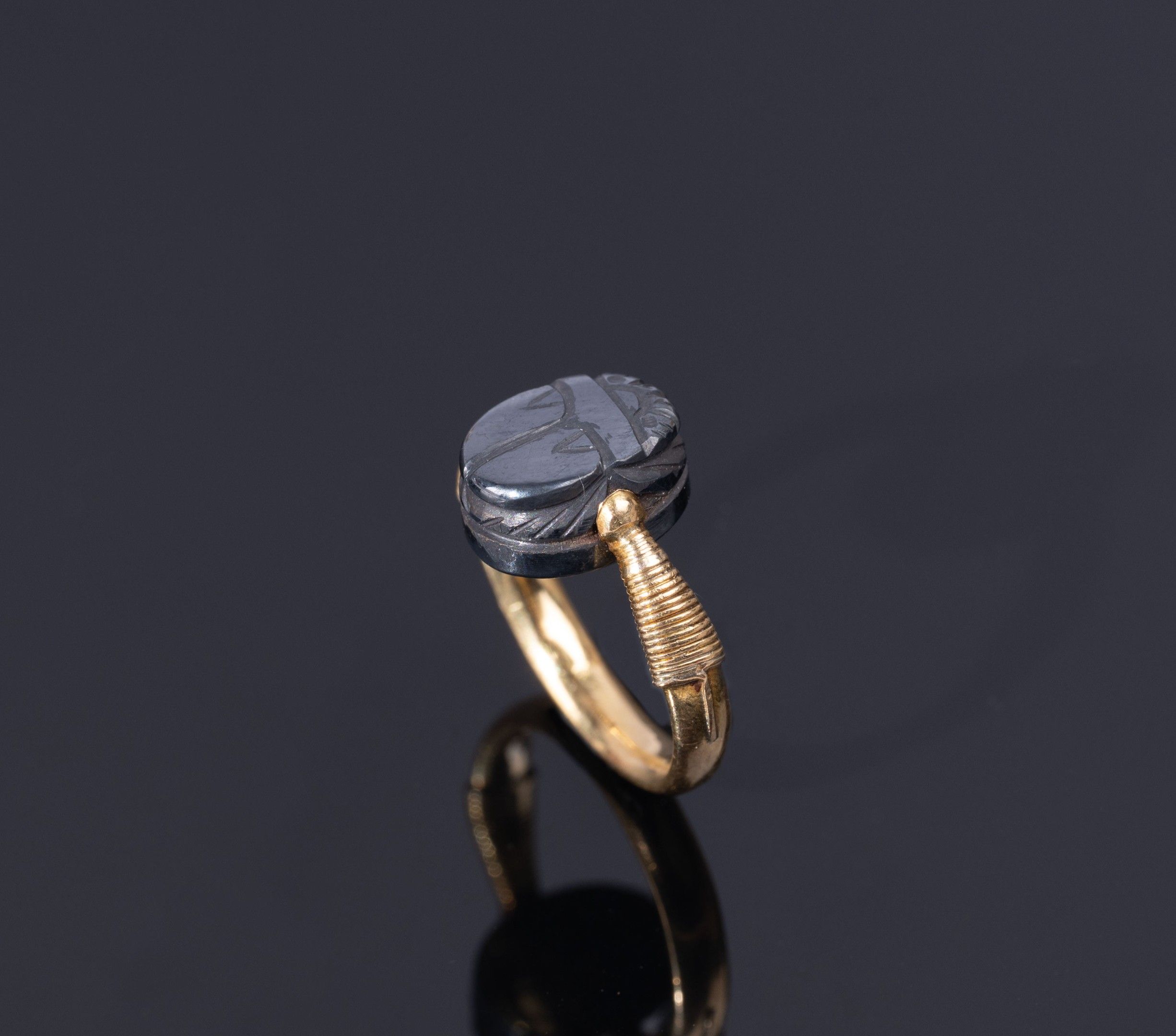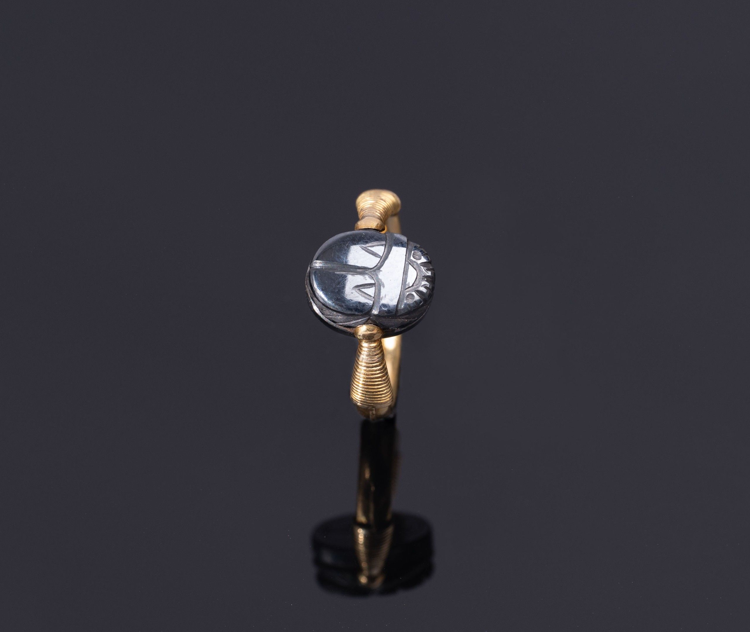 ring in yellow gold 750/1000th (18 carats) with Egyptian scarab in magnetite, gross weight 4.41g, Finger size: 43