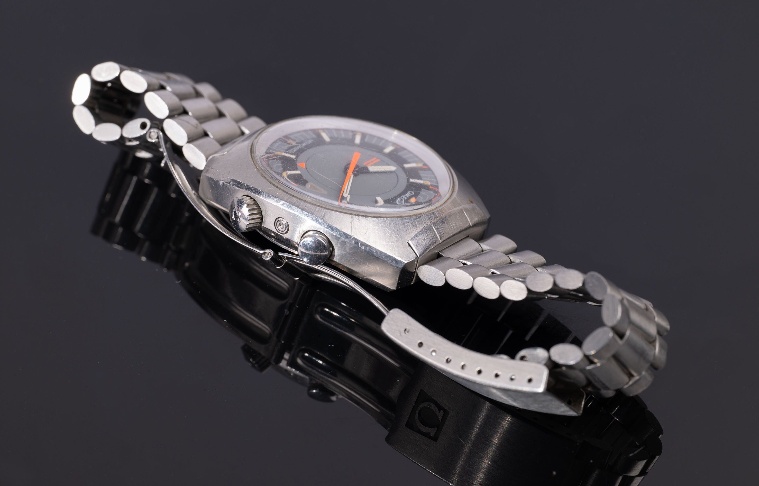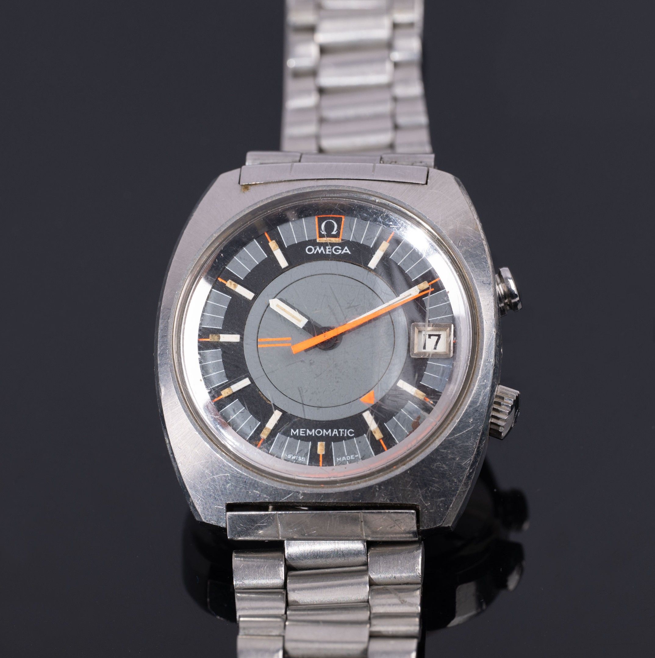 OMEGA, Memomatic, wristwatch, automatic movement, grey dial with hour markers, white hands and orange second hand, date window at 3 o'clock, Omega steel bracelet, L: 42.56mm