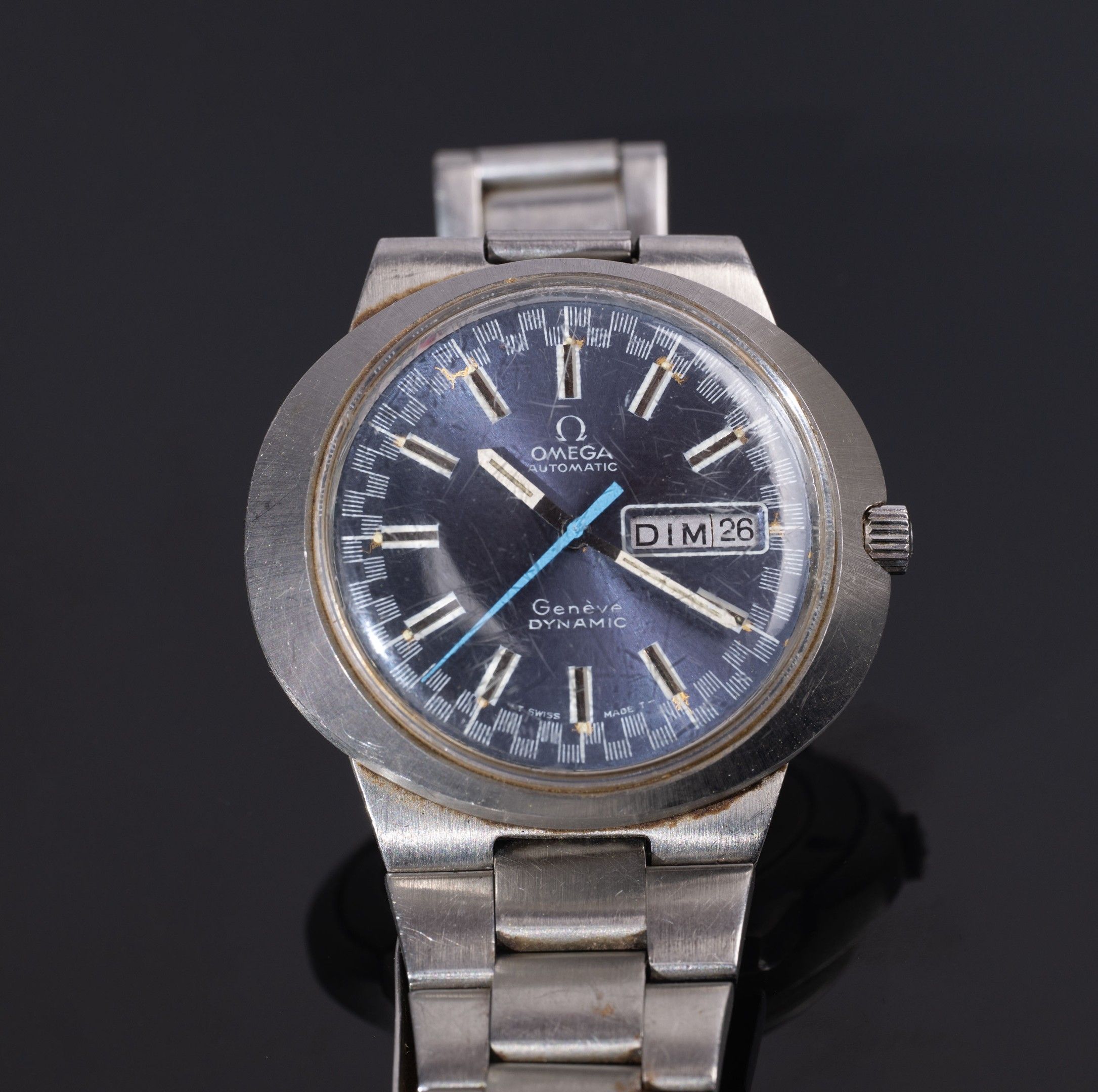 OMEGA, Dynamic, men's wristwatch, automatic movement, blue dial with hour markers, day and date window at 3 o'clock, Omega steel bracelet, L: 42.8 mm