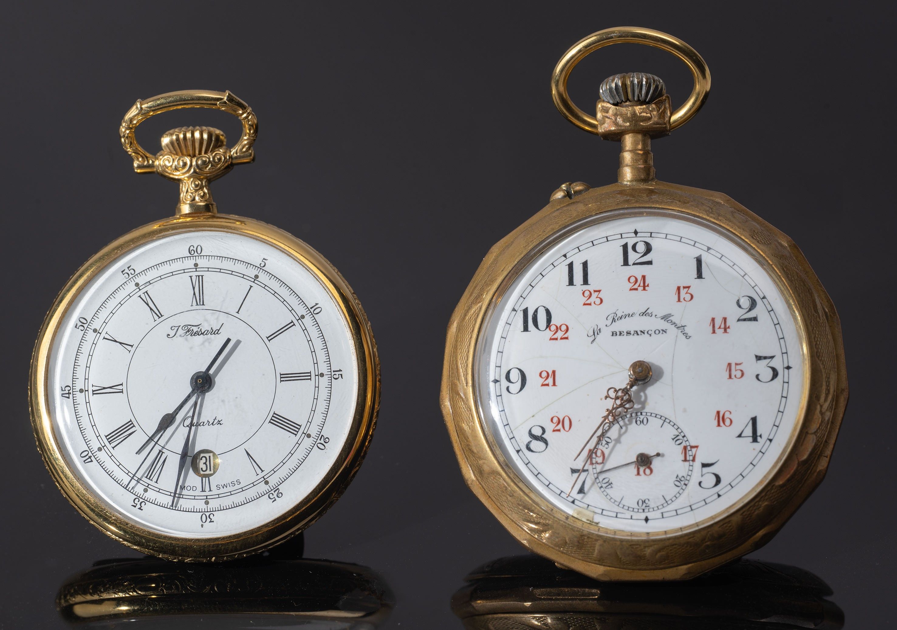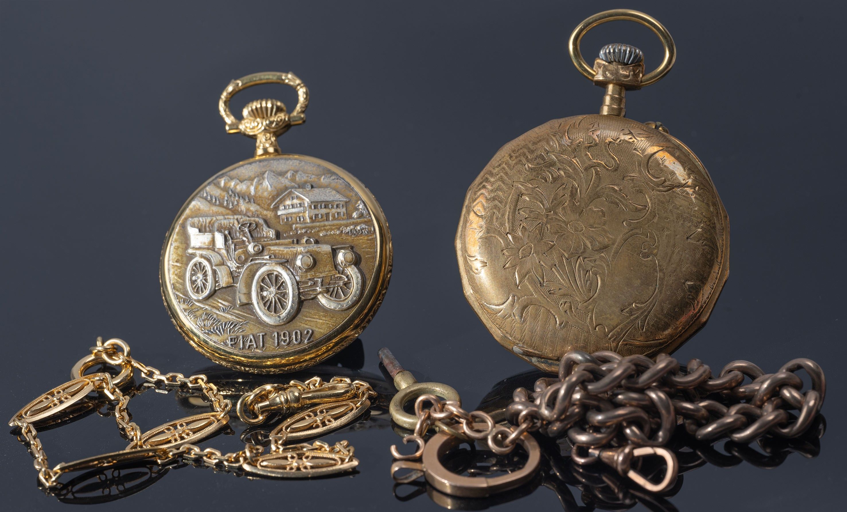 Two gilt metal gusset watches, one J. Fresard with a car decoration on the back and the inscription Fiat 1902 and the other La reine des montres, Besançon (accident to the enamel on the dial), two gilt metal watch chains are attached.