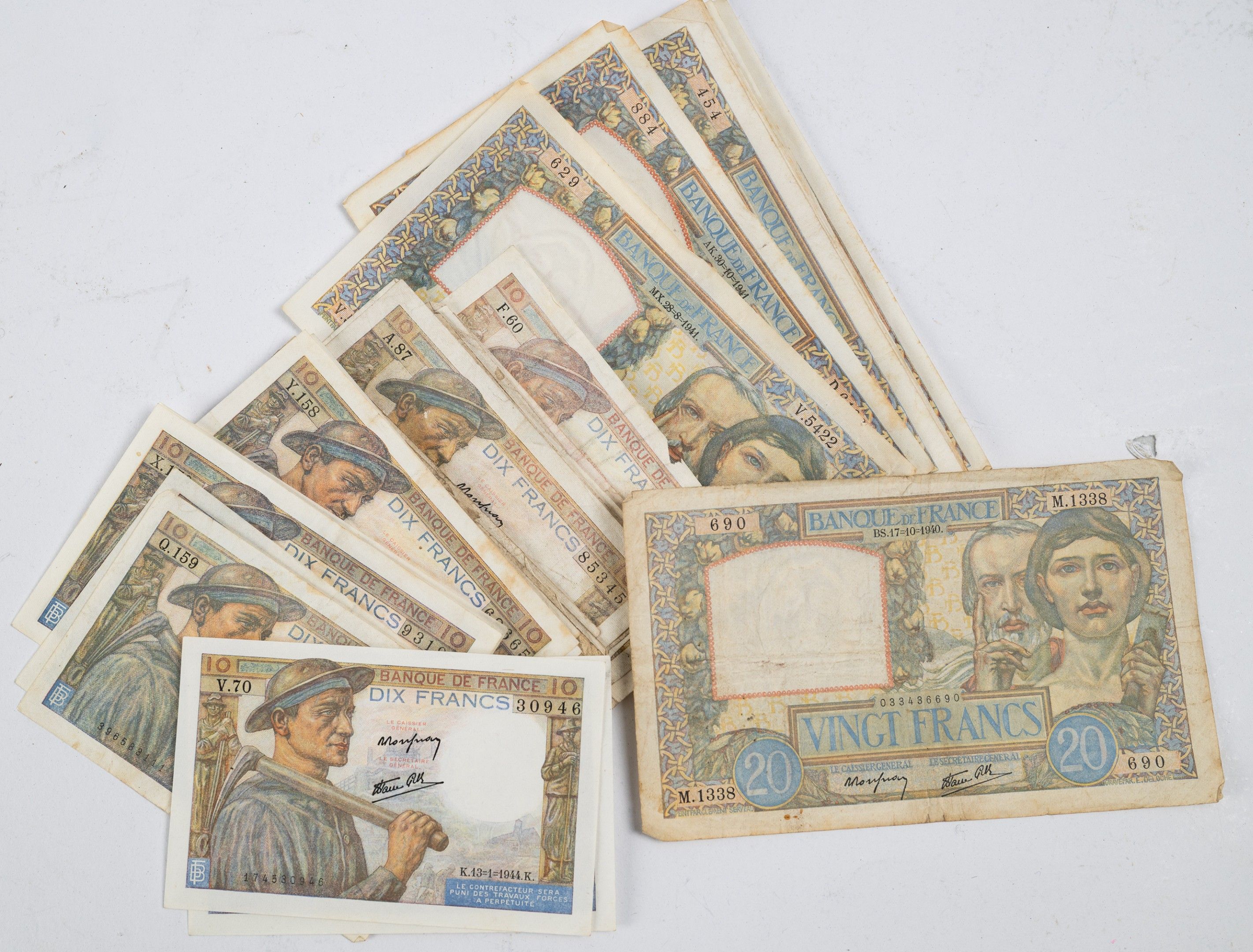 9 banknotes of 20 francs 1941 25 notes of 10 francs 1944