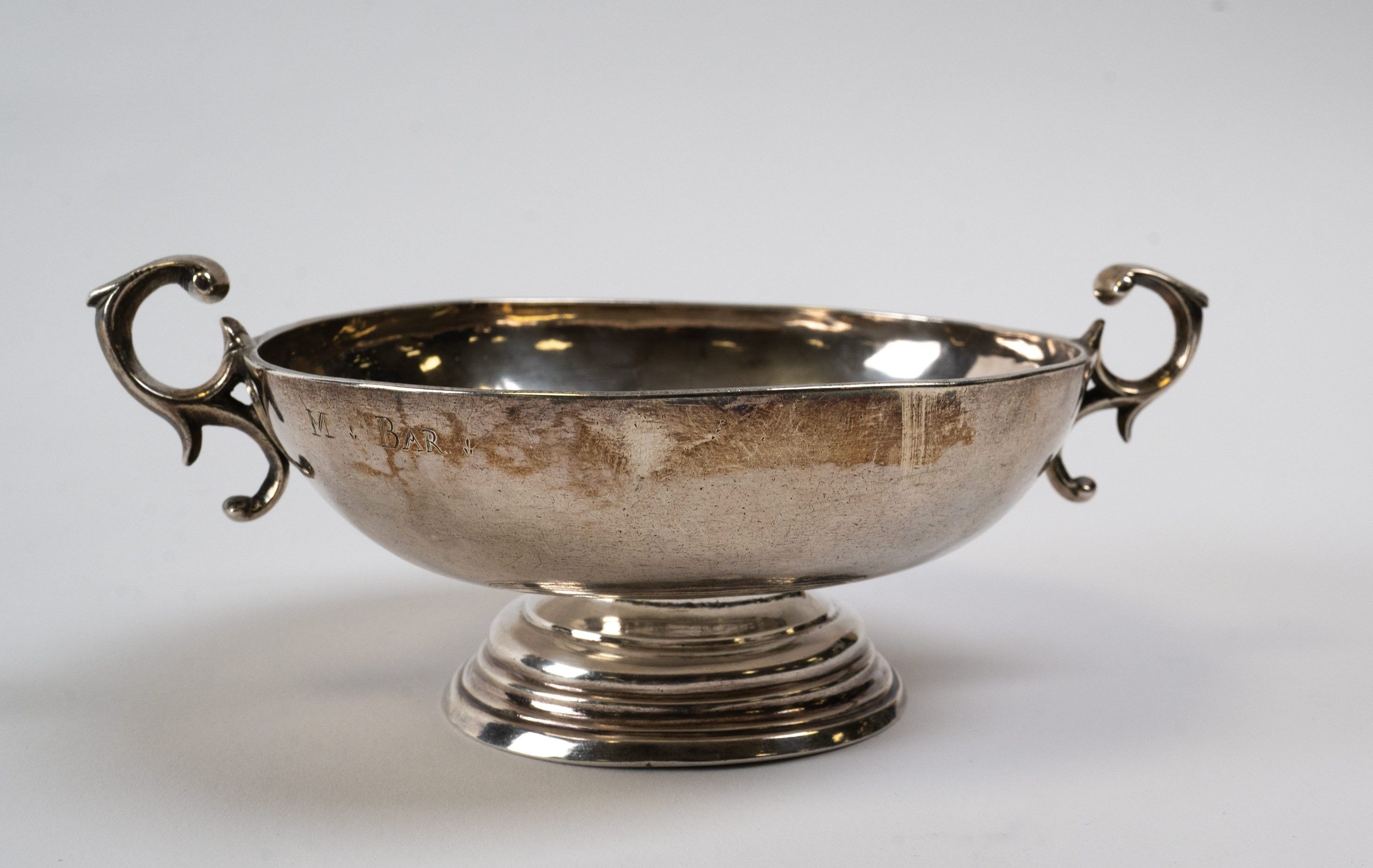 Silver wedding cup, probably Dijon hallmark 1756-1759, Beaune master goldsmith hallmark L.E with Virgin with bunch of grapes. Weight 306 g, engraved "given by M.Gle Bard to his nephew Joseph Bard on 25 July 1827", H: 7 cm, W: 18.5 cm
