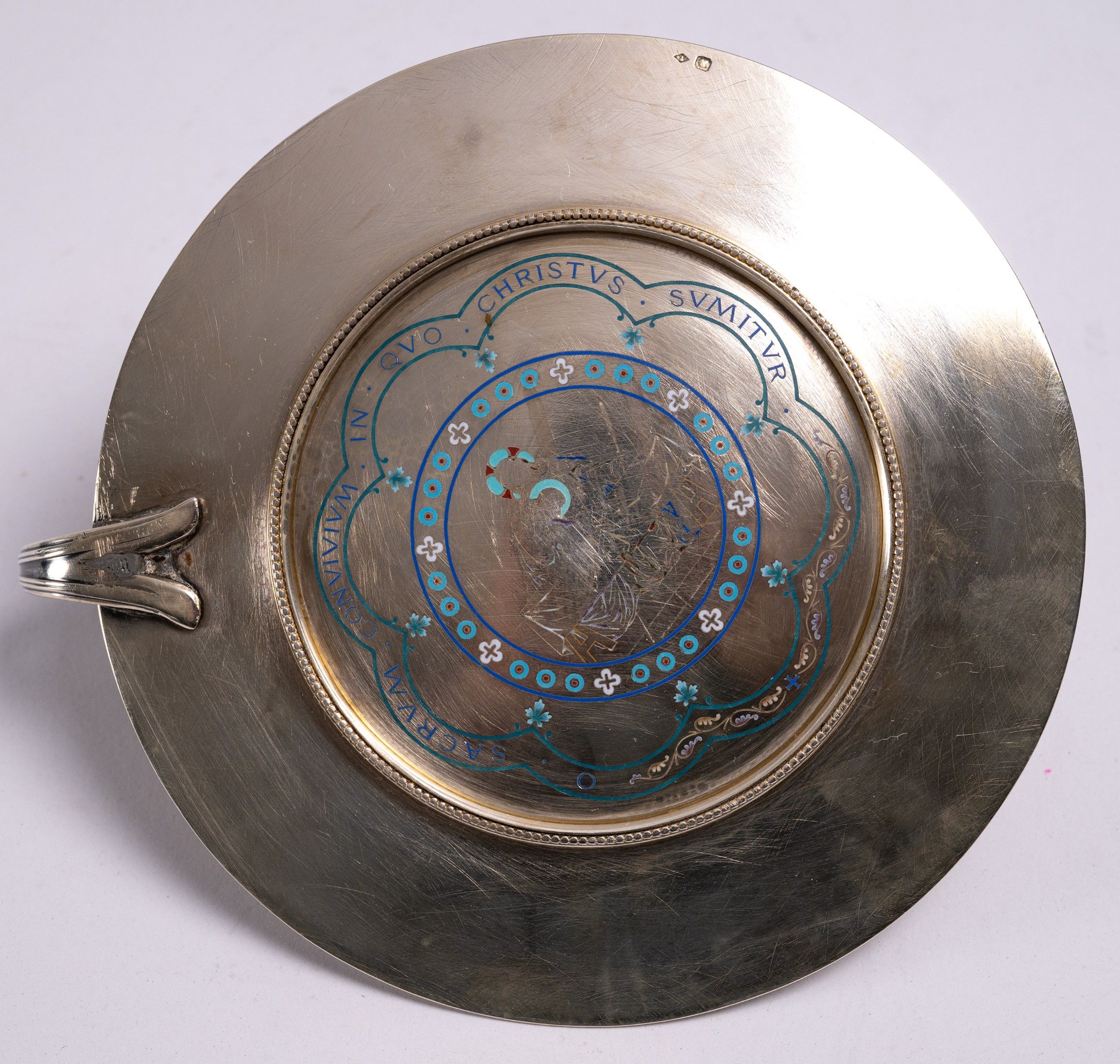 ARMAND-CALLIAT, Lyon, 925/1000 silver lithurgic rat-de-cave, the base decorated with enamels depicting a resurrection under an inscription: "O sacrum convivium in quo Christus sumitur", the finely chased and enamelled bezel, H: 6.5cm, L: 18cm, weight: 428g