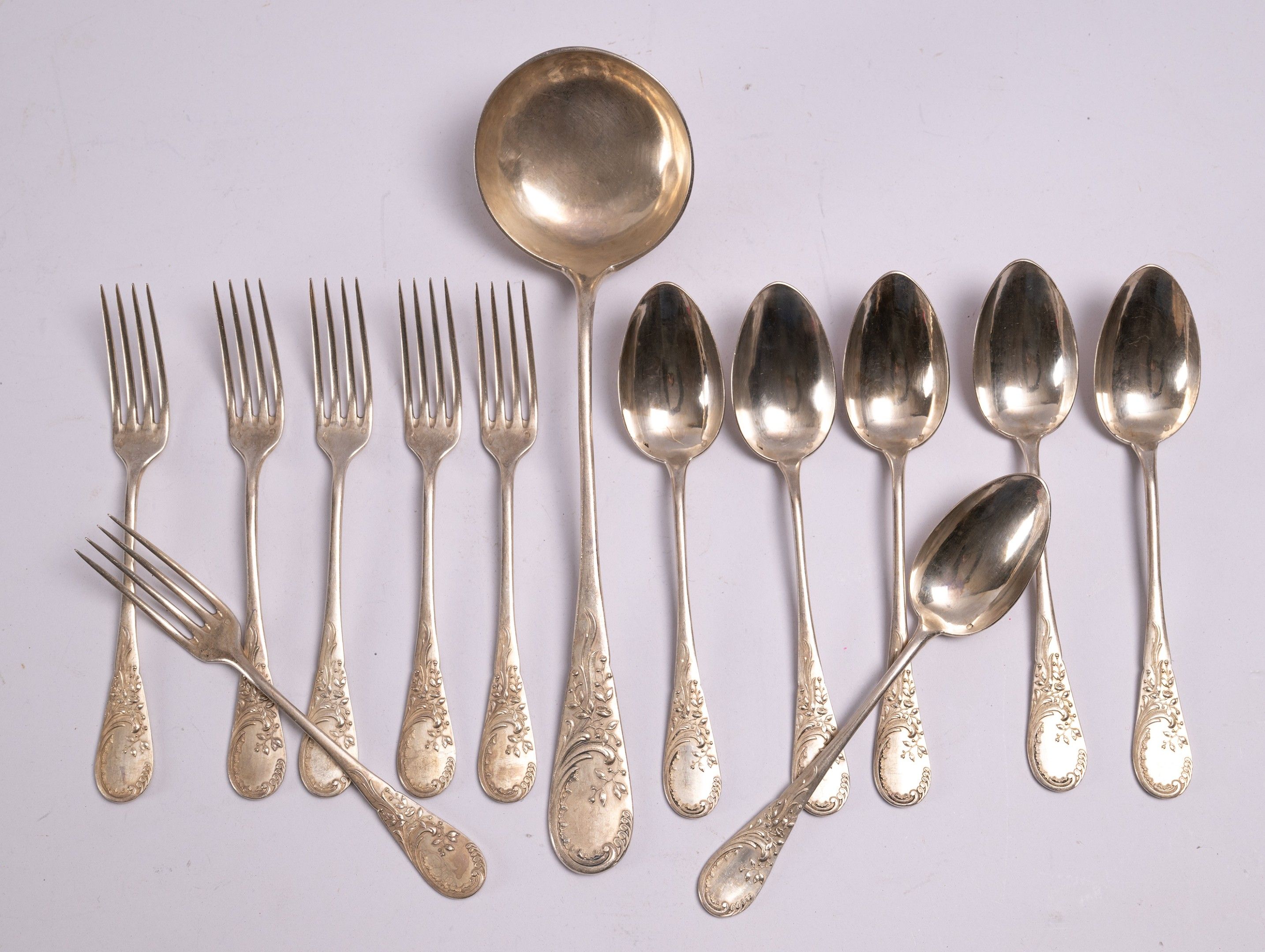 6 place settings and 1 ladle in 925/1000 carved silver with rocaille decoration. Weight : 950g
