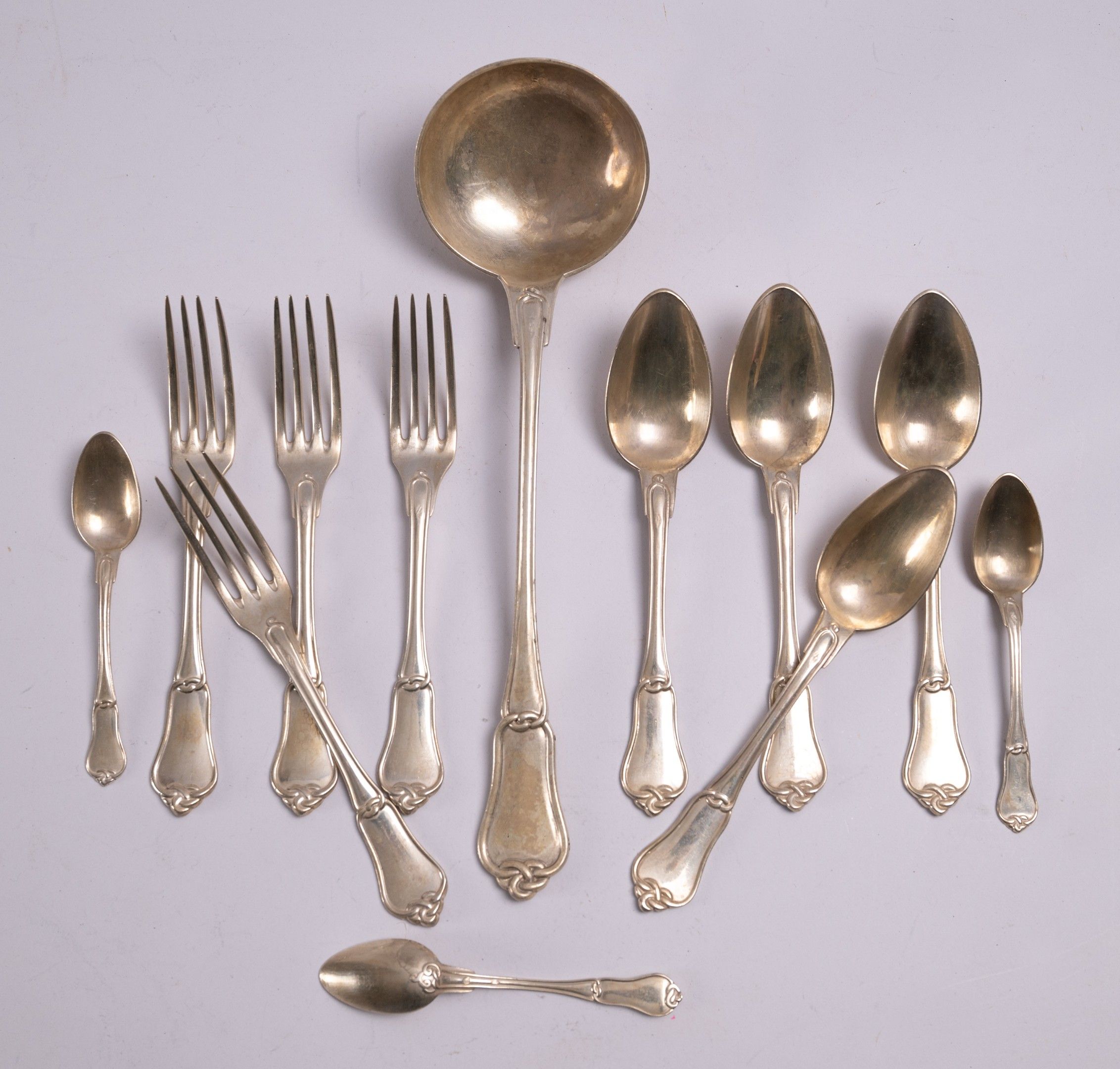 Set of 4 forks, 4 spoons, 3 teaspoons and 1 ladle in 925/1000 sterling silver. Weight: 1042g