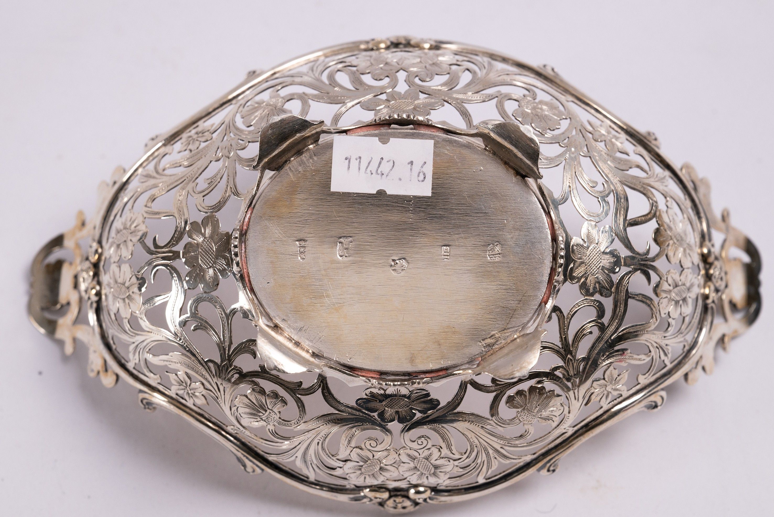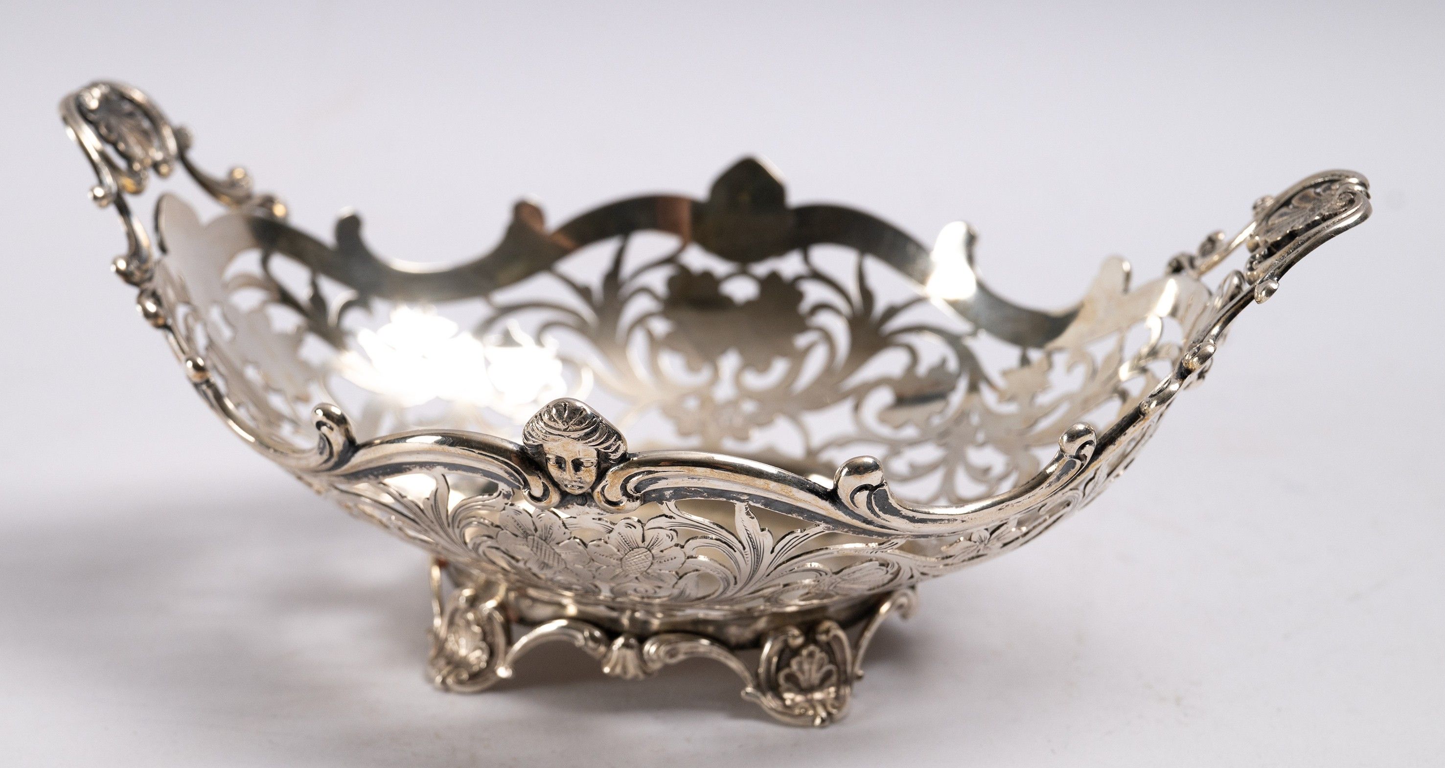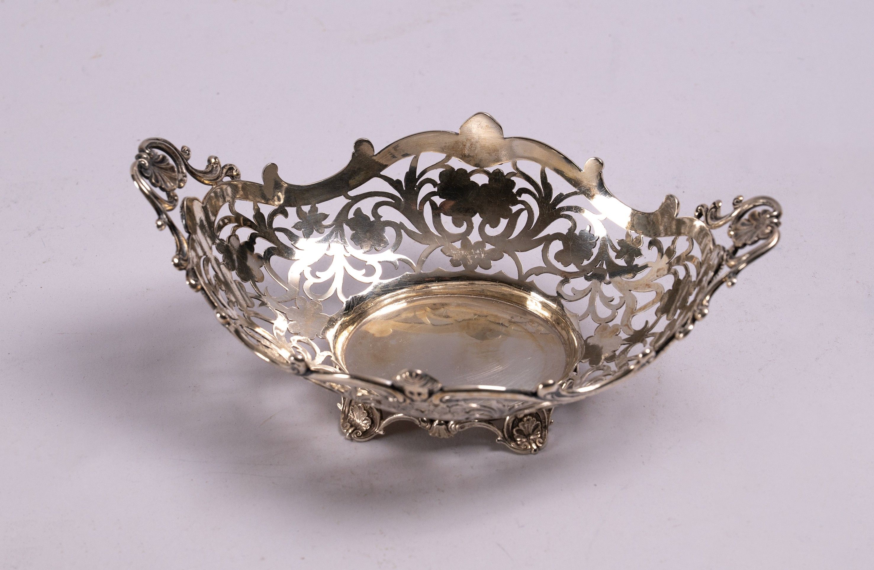 England, small openwork silver bowl 800/1000e. H: 7cm, L: 18cm, W: 11cm, weight: 158g