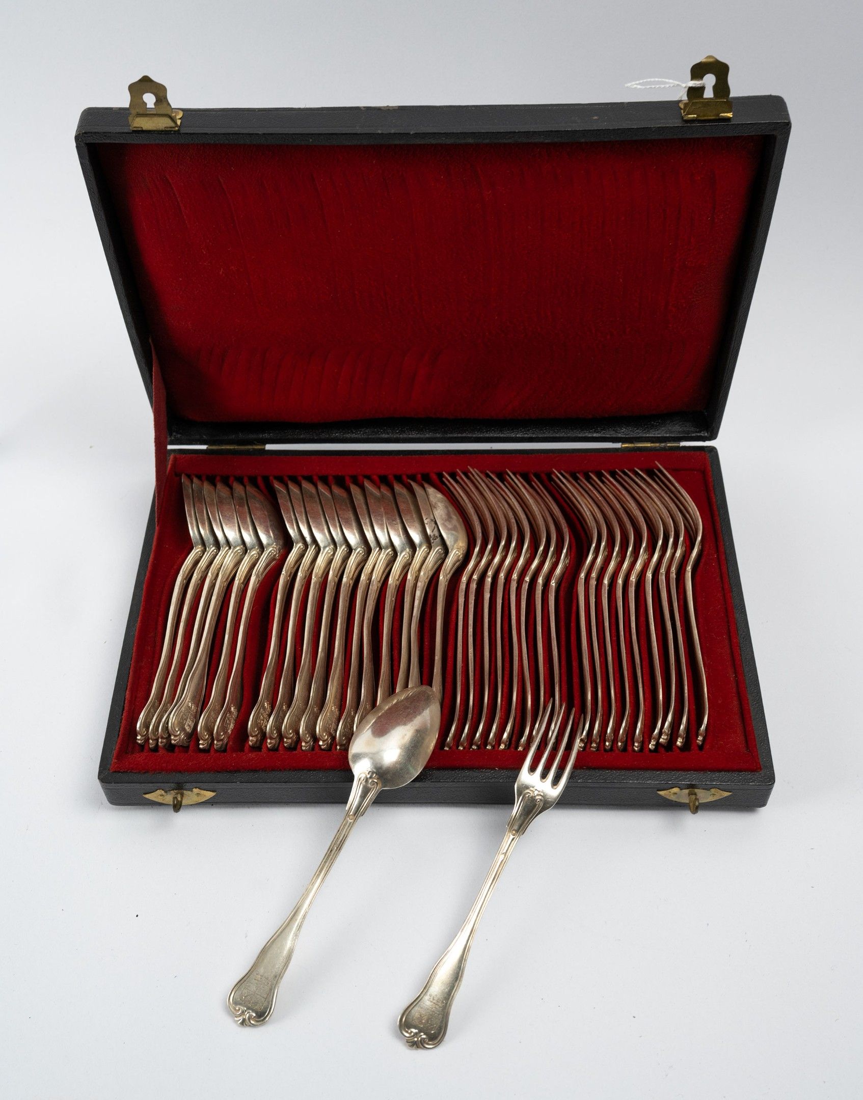Set of 18 silver 925/1000 dessert servers, scroll pattern. The spatulas are engraved with a double coat of arms and a baron's crown. Total net weight: 1656 g.