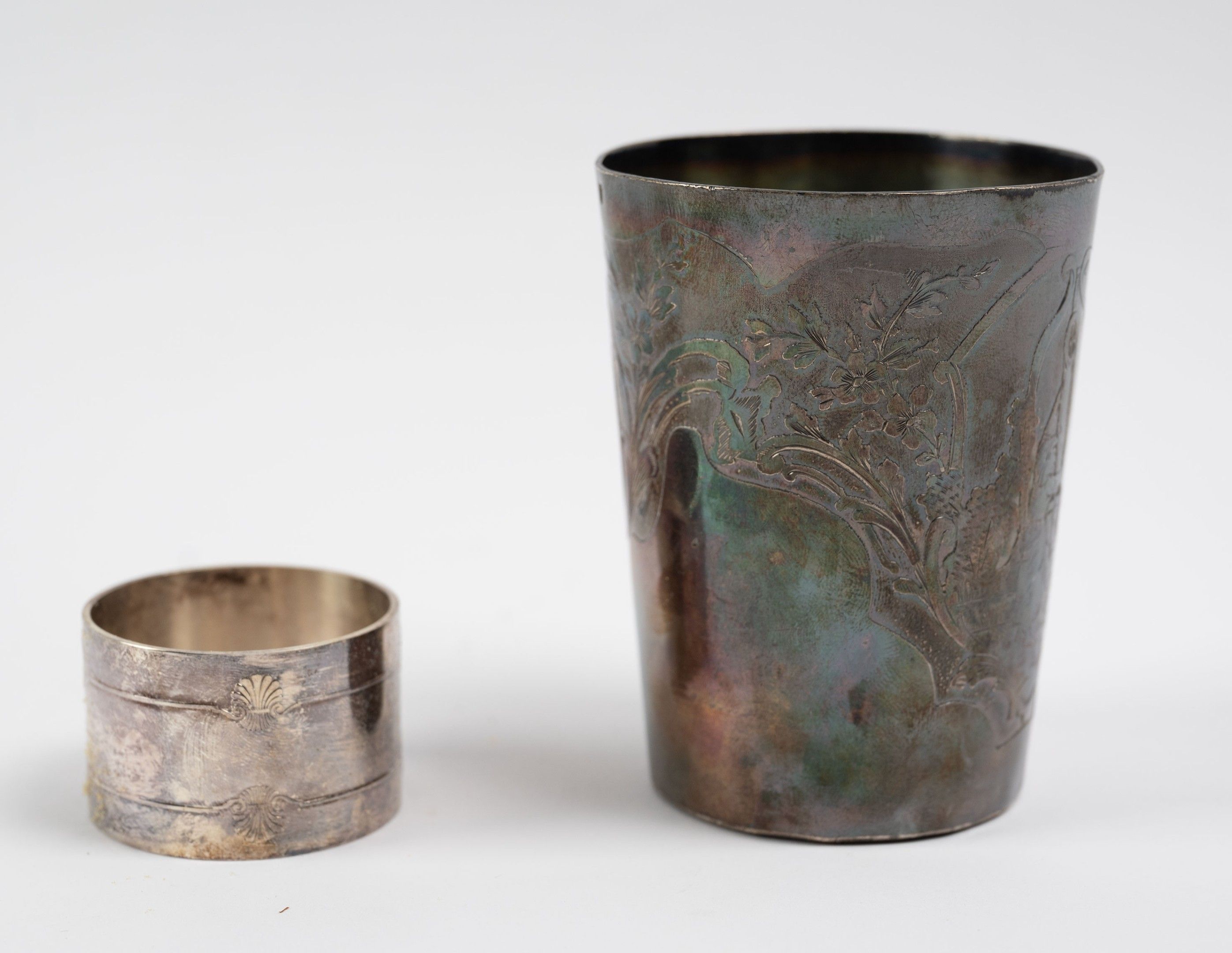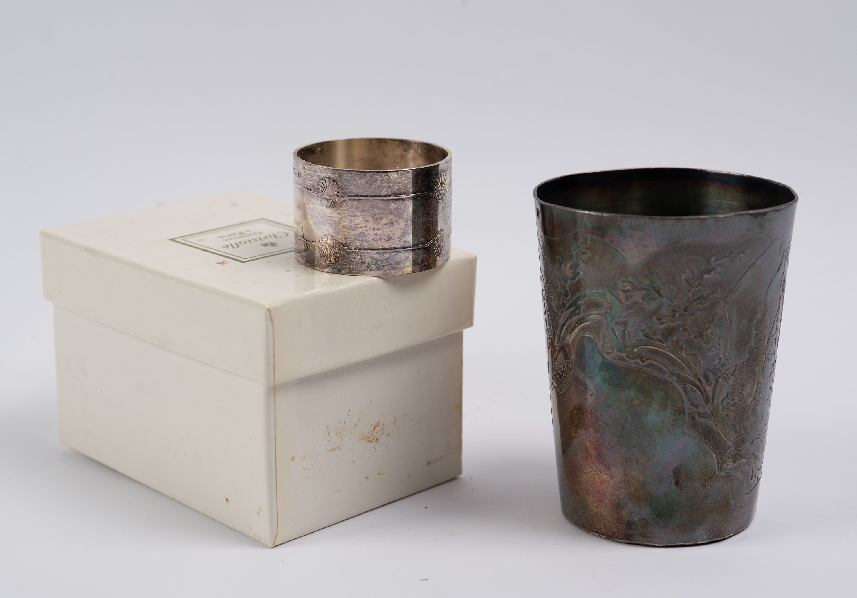 Engraved 925/1000 silver tumbler, Minerve hallmark, net weight: 106.8 g, small dents. A silver-plated CHRISTOFLE napkin ring is attached.