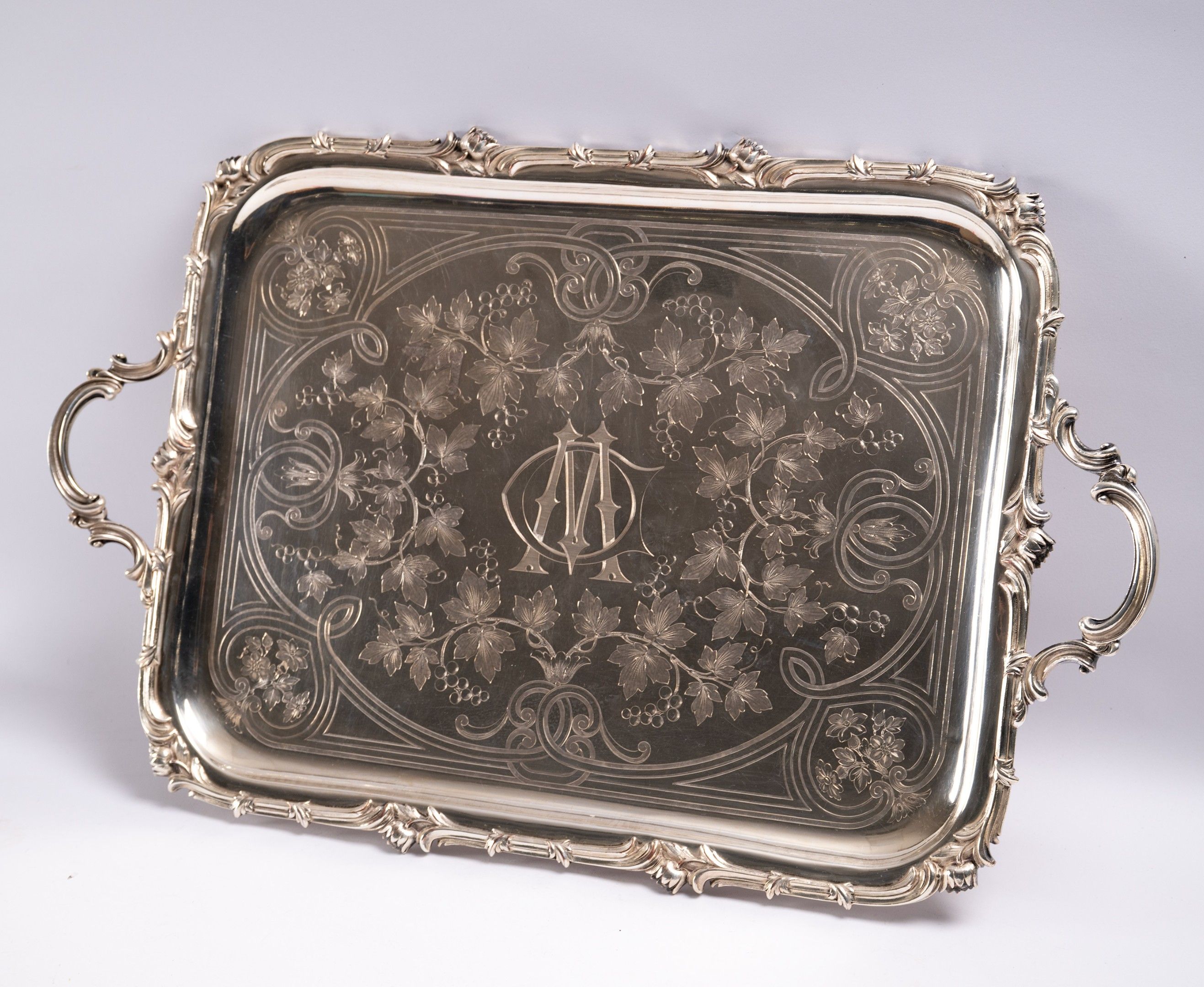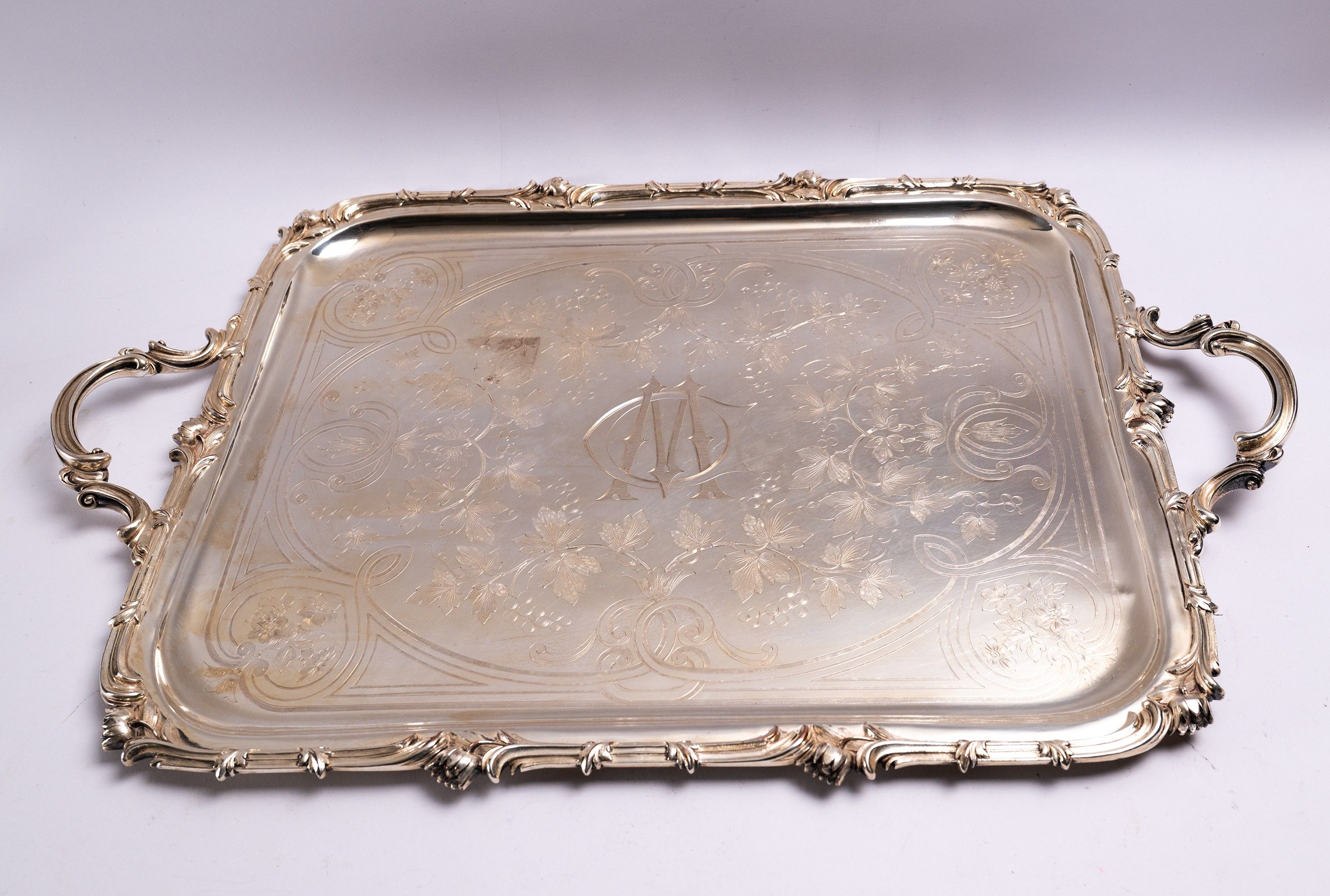 CHRISTOFLE, large silver-plated serving platter with two handles and moulded, chased and engraved foliage of vines, numbered DW. L: 74.5cm, W: 49cm