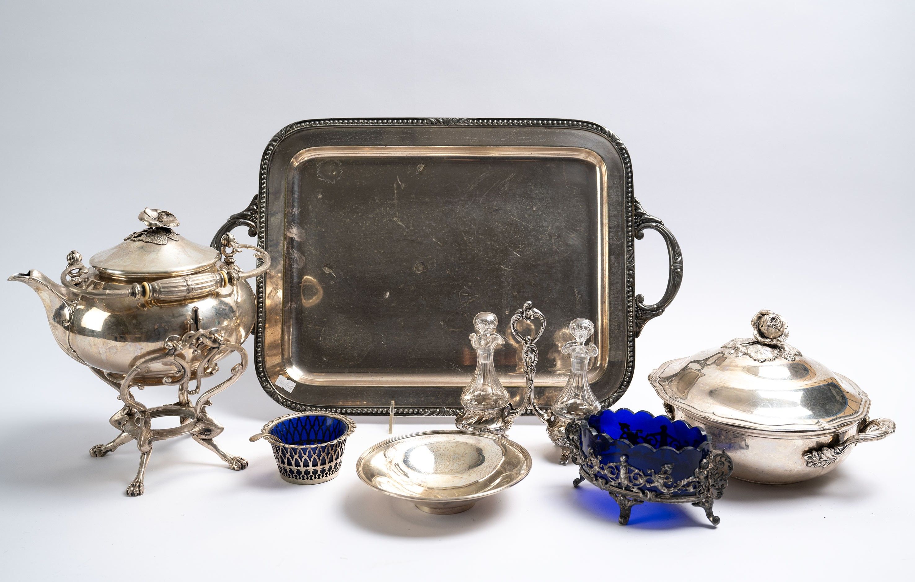 tray, samovar, covered vegetable dish, GALLIA oil and vinegar cruet, blue crystal bowl on silver mount