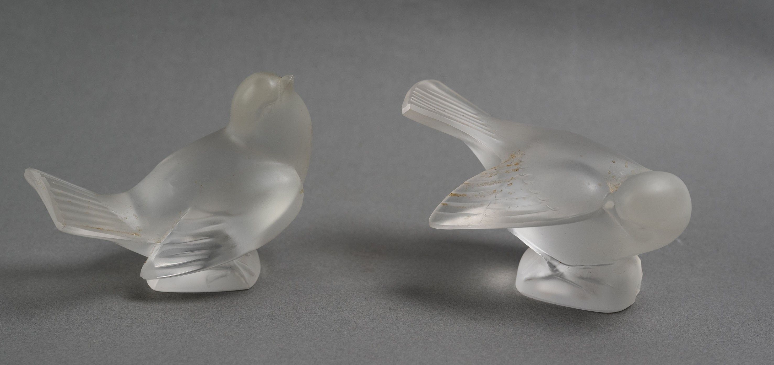 Lalique France, Two sparrows in moulded and sandblasted crystal (a small accident)