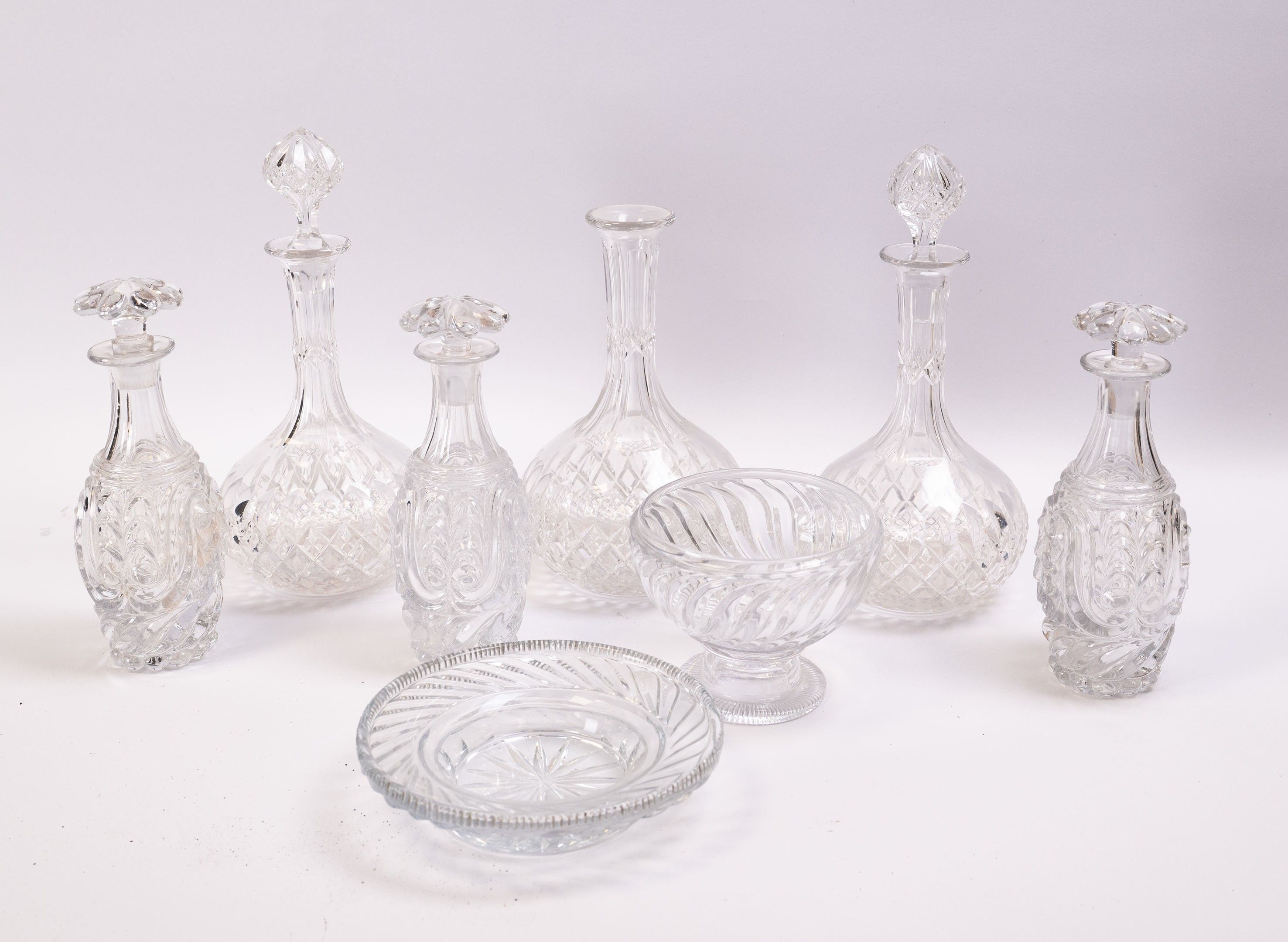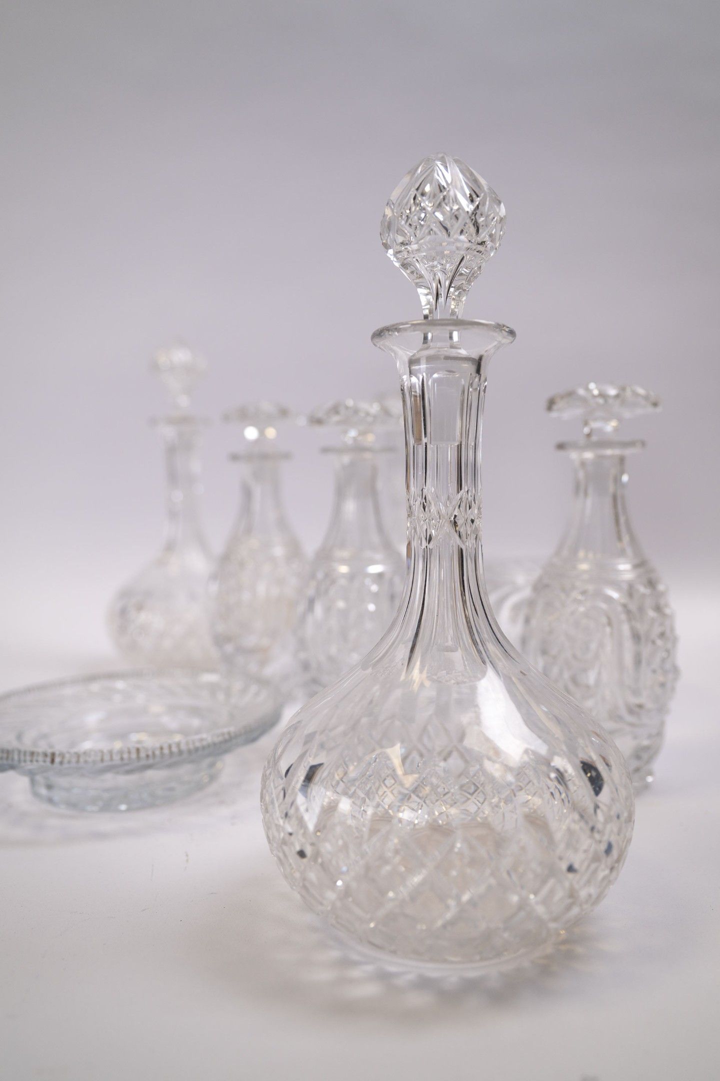 LE CREUSOT, 6 carafes and 1 bonbonnière (on its round tray) in crystal. H: from 23.5 cm to 11 cm. Missing a stopper