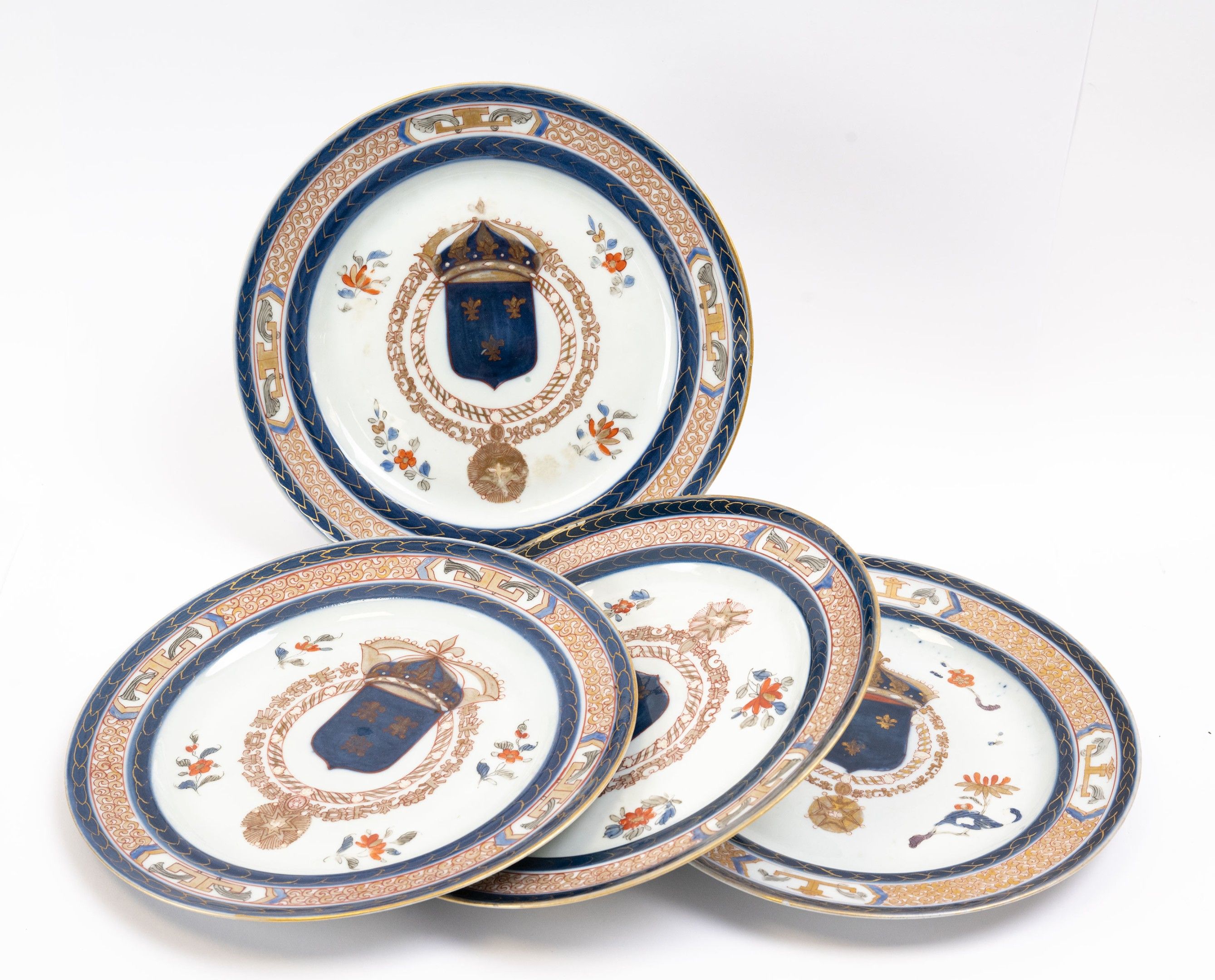 COMPAGNIE des INDES, set of 4 porcelain plates with polychrome decoration of a coat of arms of France under a crown and in the collar of the Order of the Holy Spirit, D: 23.5 cm