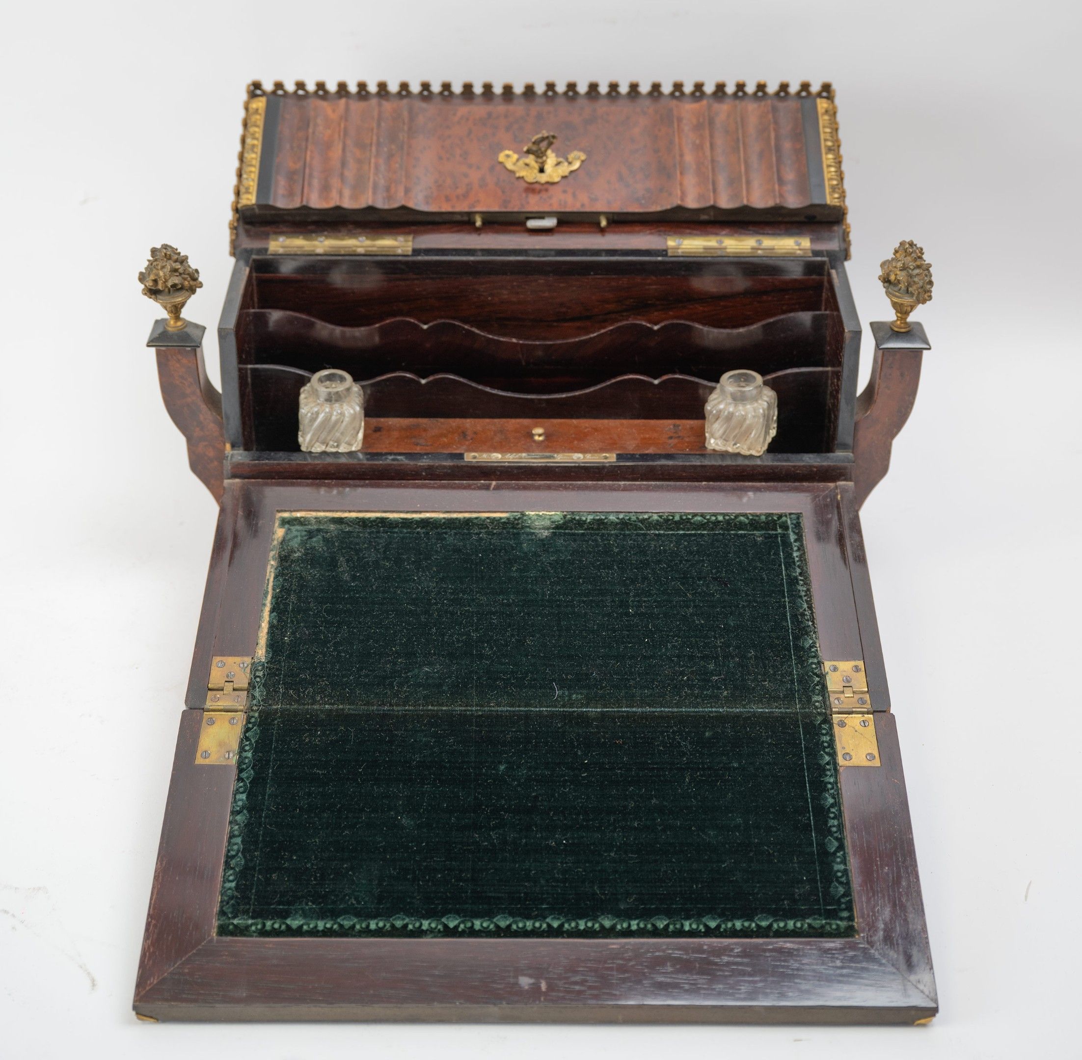 Elegant tiered writing desk in speckled mahogany veneer opening on the top with a flap sheathed in green felt and on the top with a flap in the shape of a temple pediment revealing letter trays, two inkwells and a penholder in the shape of a rifle. On either side are two colonettes, each topped by a fire pot.