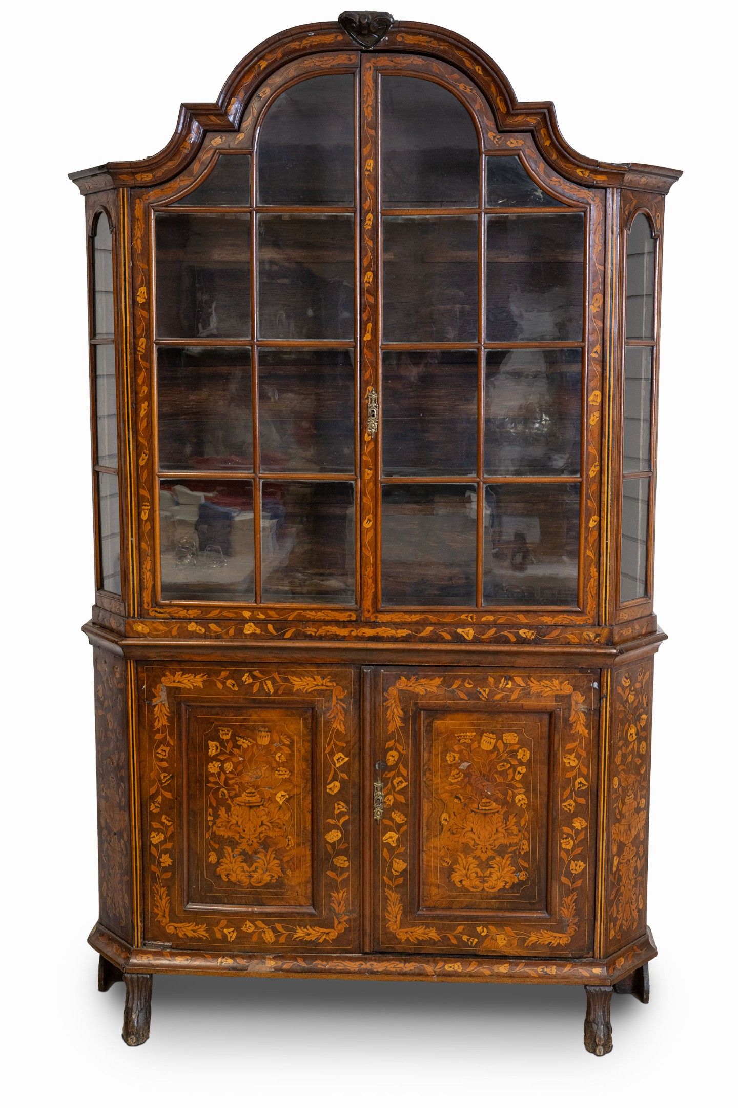 Two-part sideboard with canted sides and arched pediment, in native wood marquetry, opening with two doors at the bottom and two glass doors at the top, elegant floral decoration on all sides, doors and uprights, Flemish work from the early 18th century, H: 240 cm, W: 133 cm, D: 37 cm