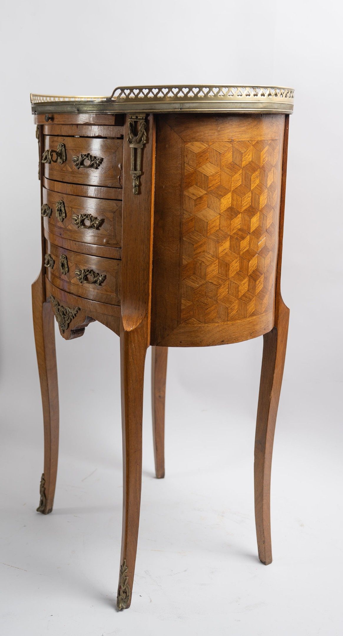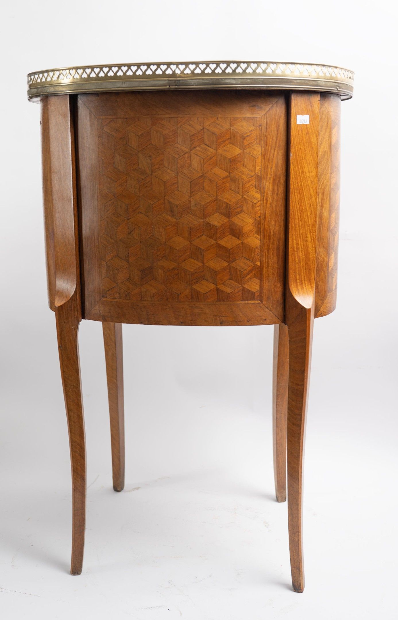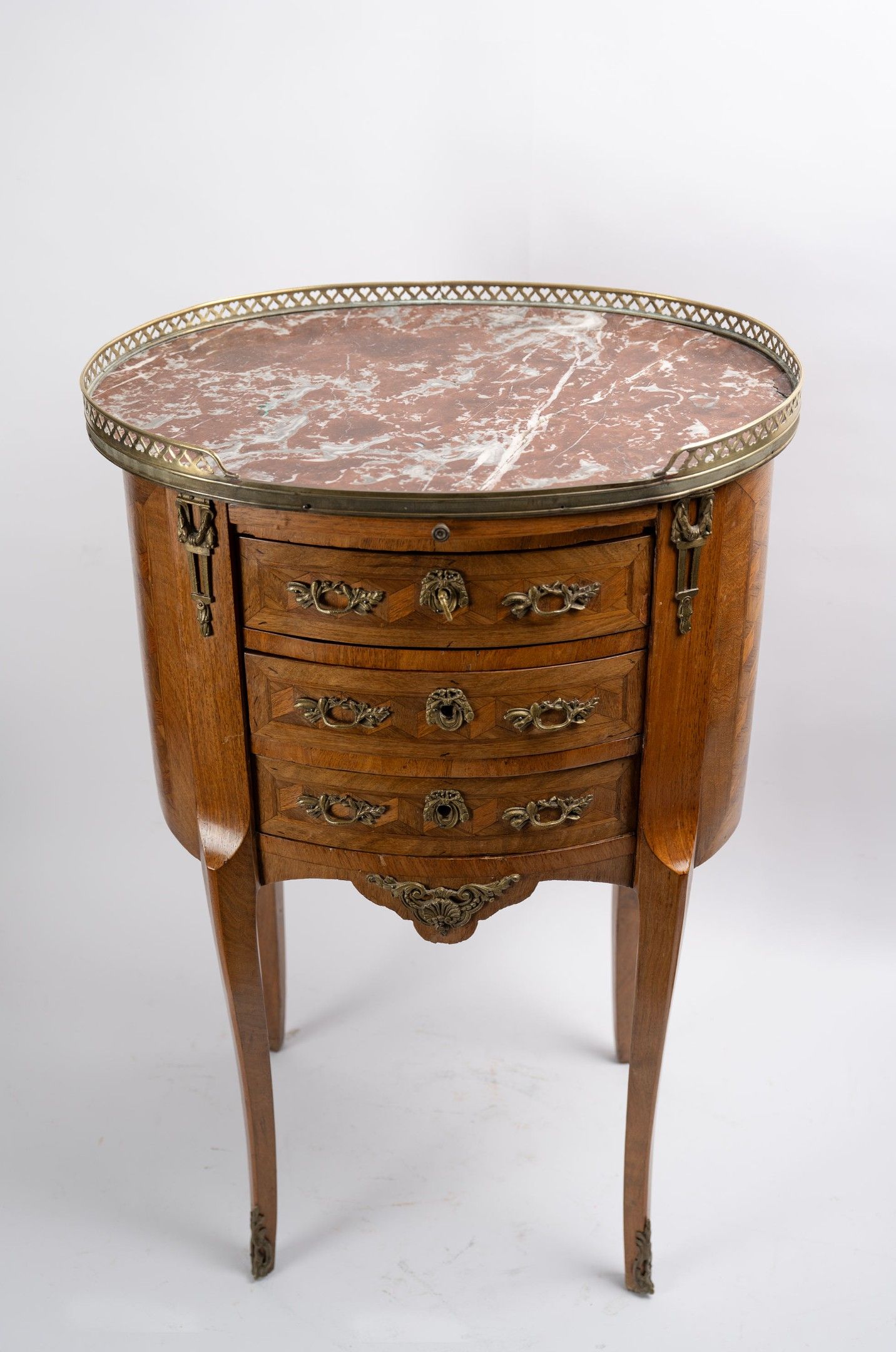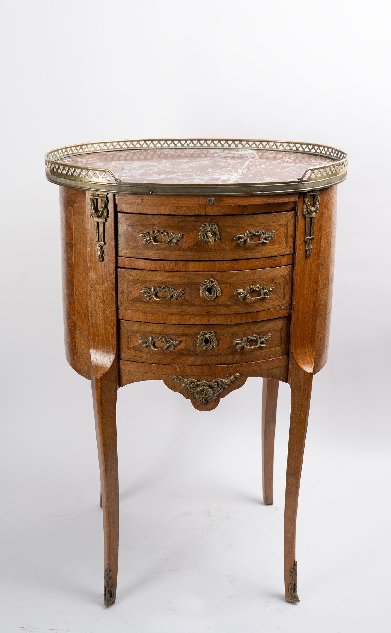 Small marquetry middle table, oval marble top with gilded brass gallery, opening with three drawers and a shelf at the front. With a key. Louis XV style, 19th century. Split marble, small accidents. H: 80 cm, W: 53 cm, D: 38 cm