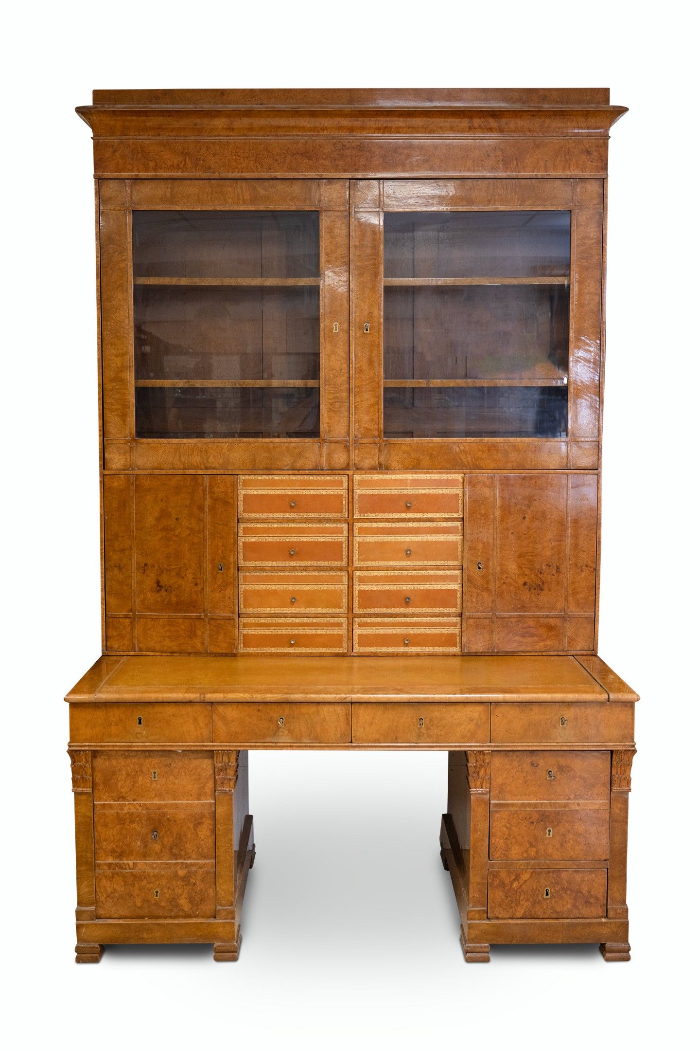 Burr elm pedestal bookcase desk, the upper part opening with 4 doors and 8 cardboard pedestals, covered in cold gilded leather, and the lower part opening with 8 drawers, the uprights of the lower pedestals are carved with Corinthian capitals, the sliding top is also covered in cold gilded leather, French work from the Charles X period, H: 240 cm, W: 154 cm, D: 67 cm, a small lack of veneer.