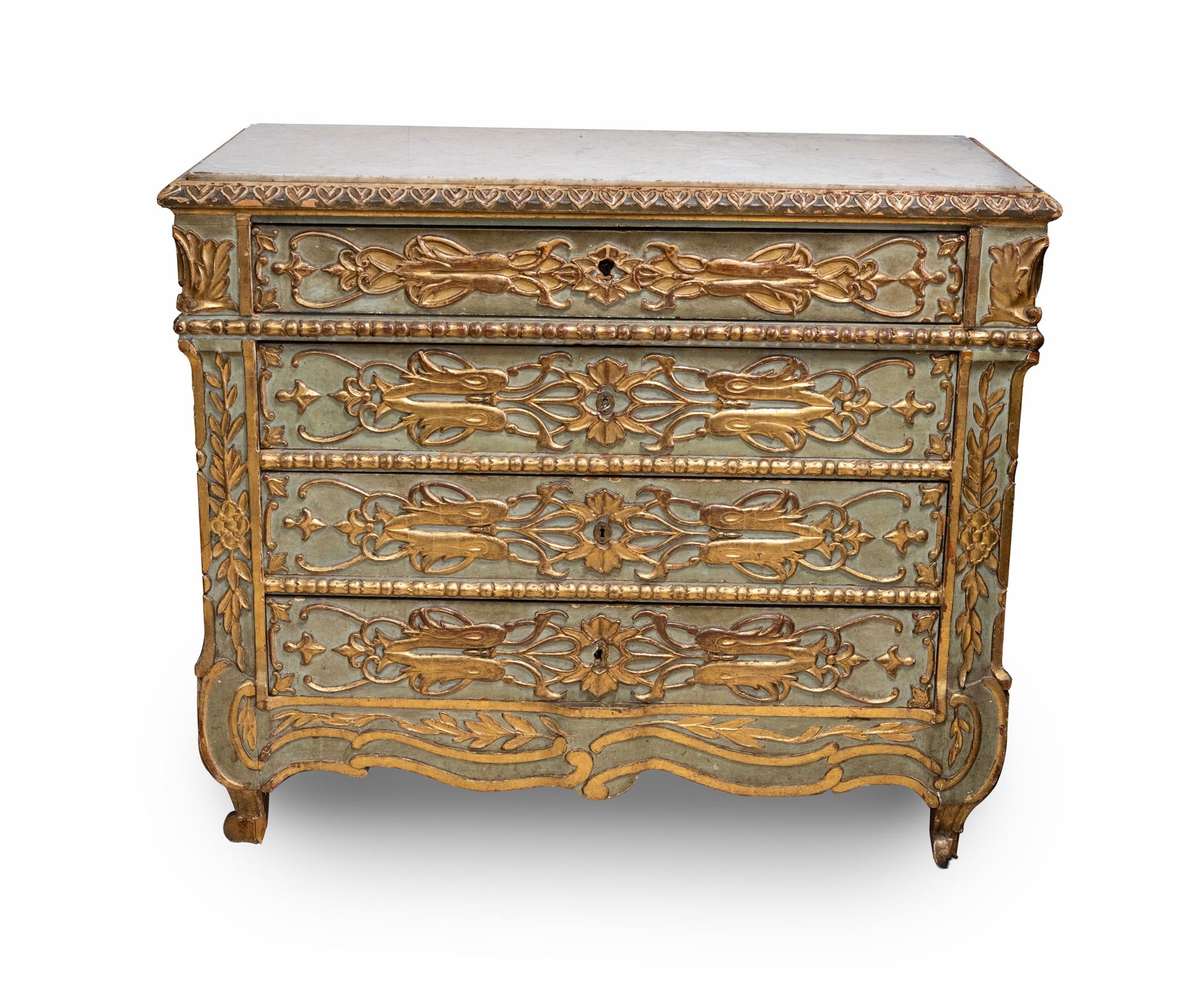 Venice or Ottoman Empire 18th century, chest of drawers with a slightly raised central section in carved, celadon lacquered and gilded wood, opening with four drawers, decorated on all three sides with carved and gilded stylised flowers, the uprights slightly raised above the slightly recessed legs, white marble top (accident) in a frame with a cornice beak carved with hearts, Venetian or Ottoman work from the end of the 18th century, H: 100 cm, W: 117 cm, D: 56 cm, accidents and missing legs.
