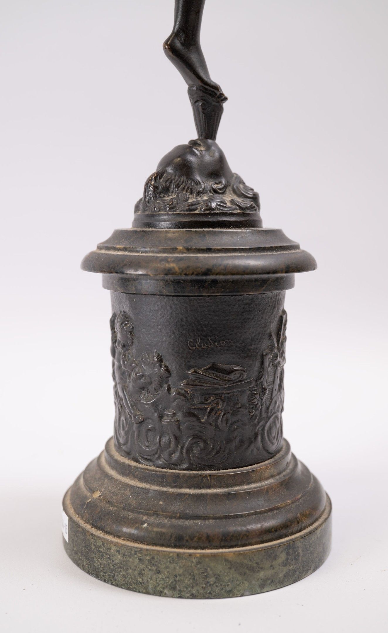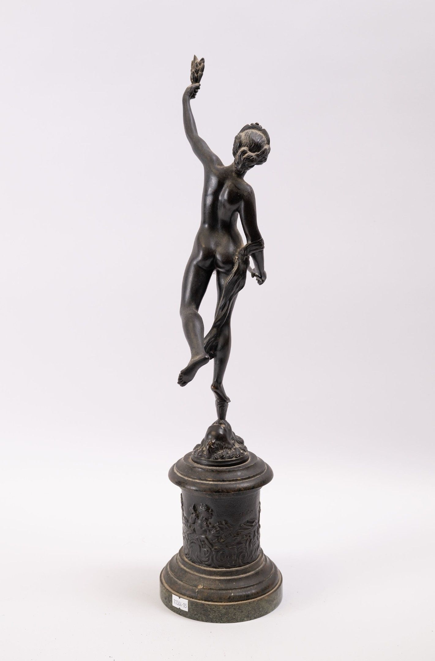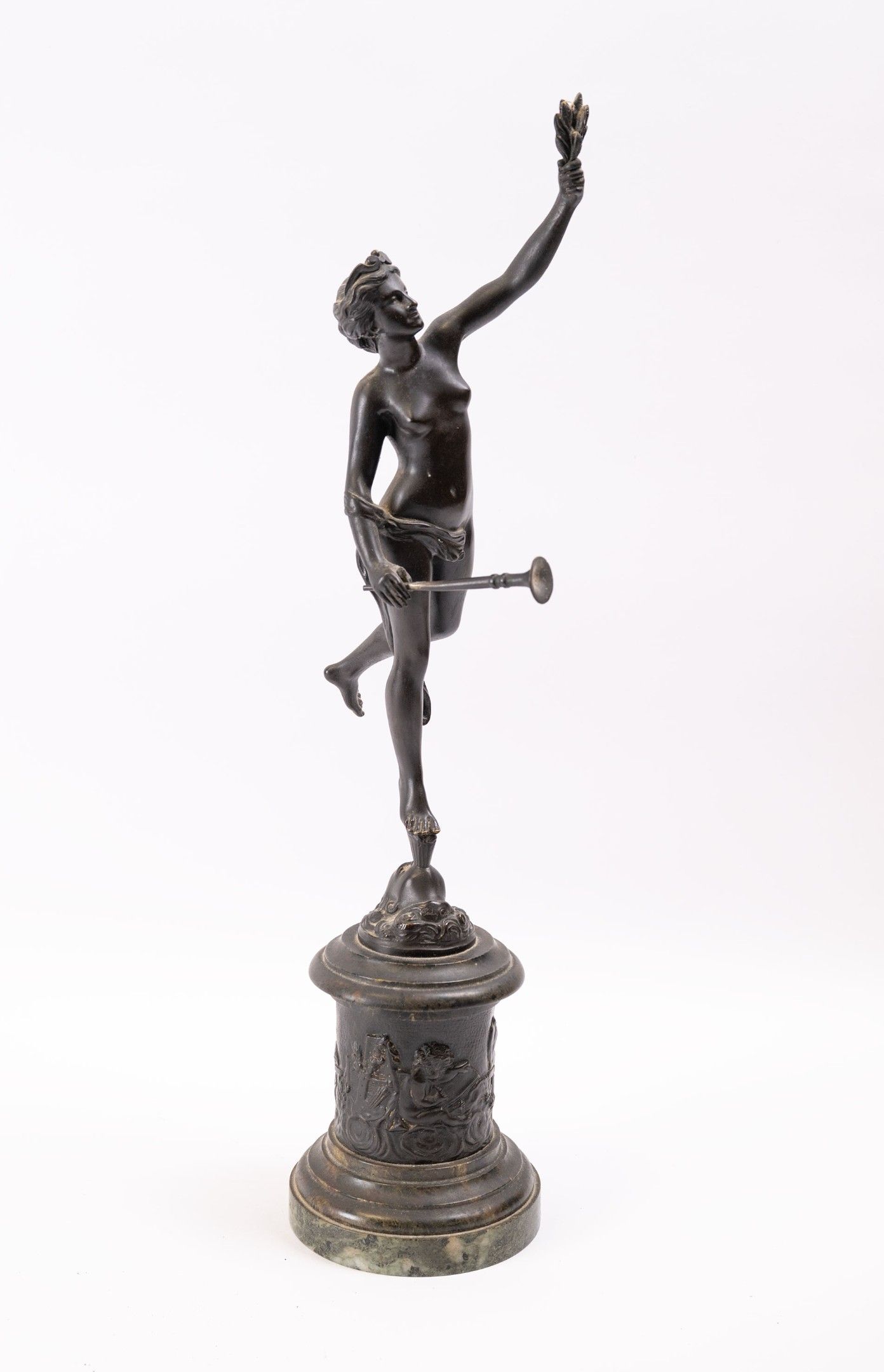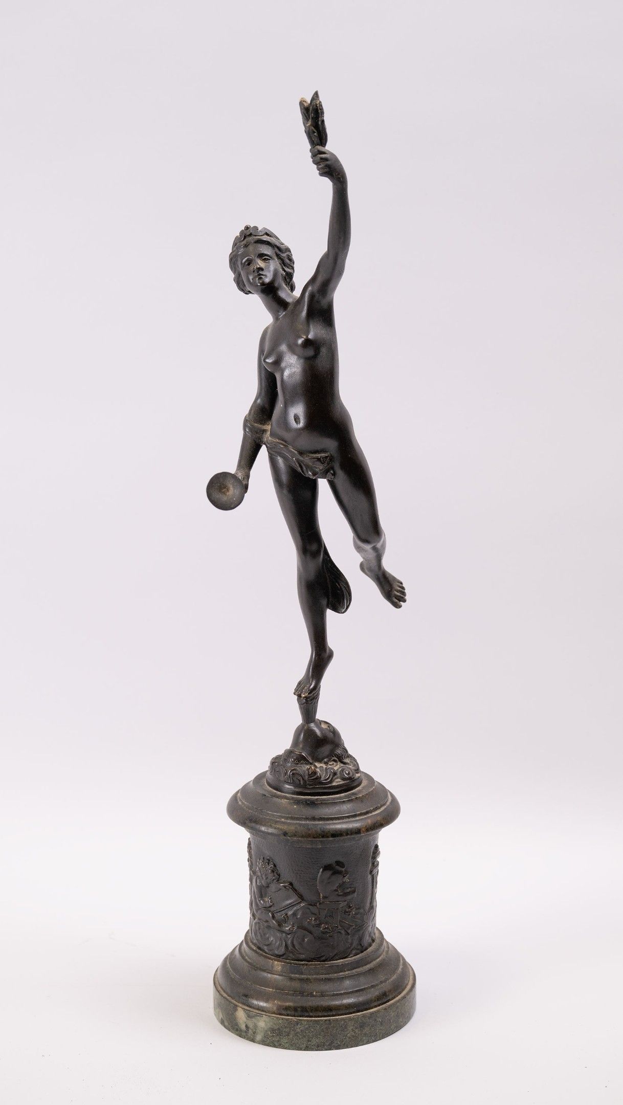 CLODION (1738-1814), after, "Renommée", dark patinated bronze on a green marble base, the cylinder of the pedestal decorated with bas-reliefs representing the liberal arts, signed by Jean de Bologne, H: 56 cm