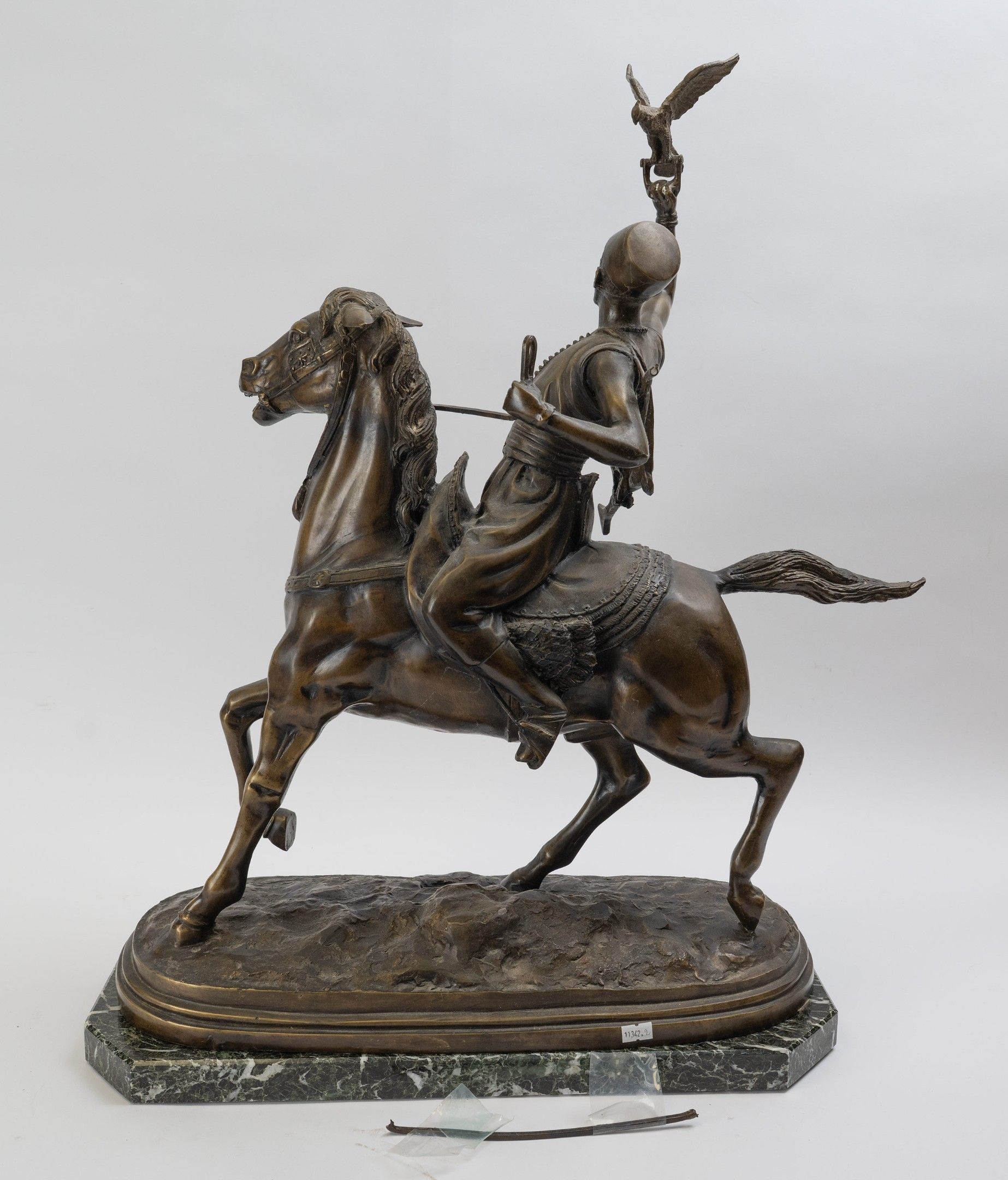 French school, 19th century, "The horseman with a hawk", patinated bronze, H: 68 cm
