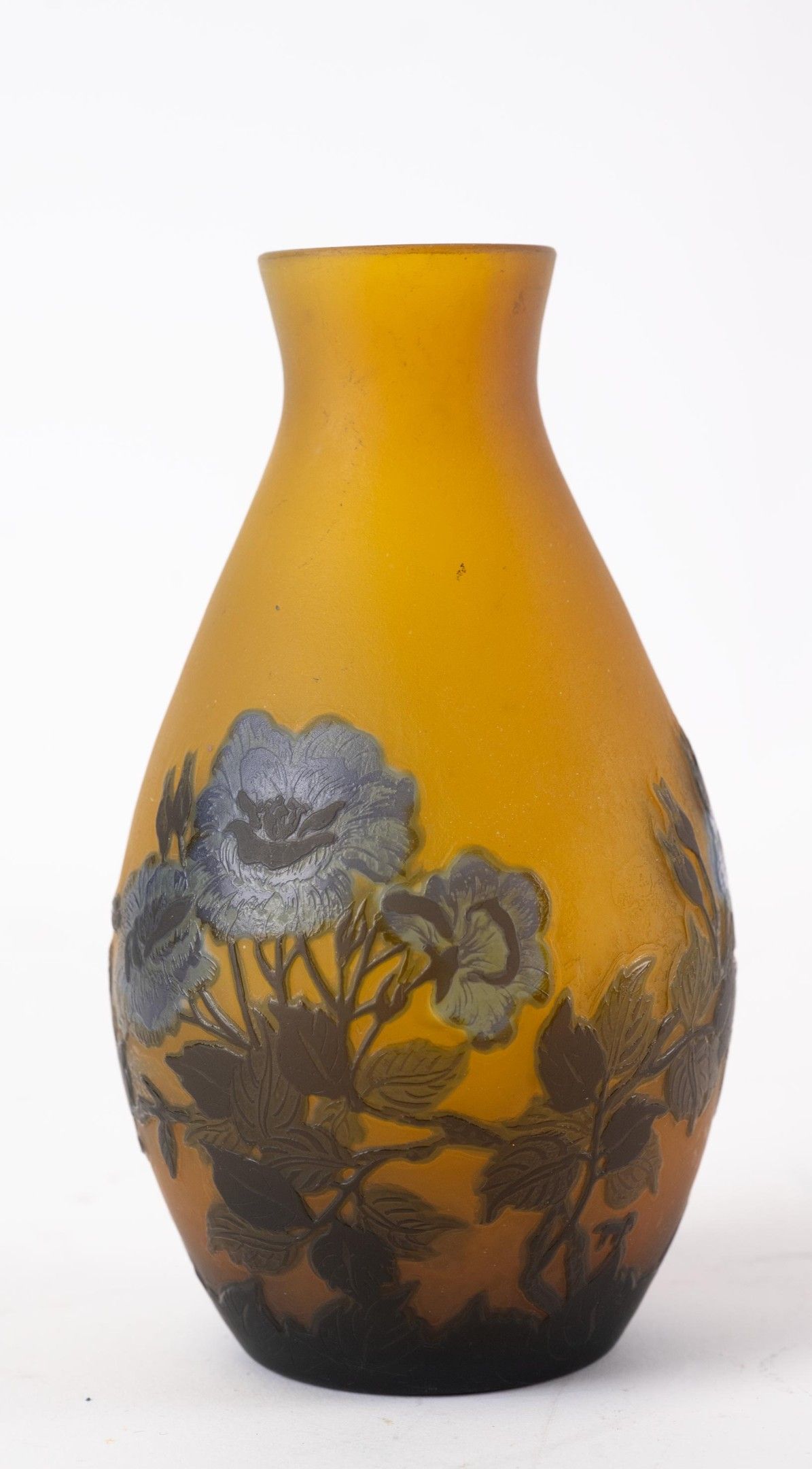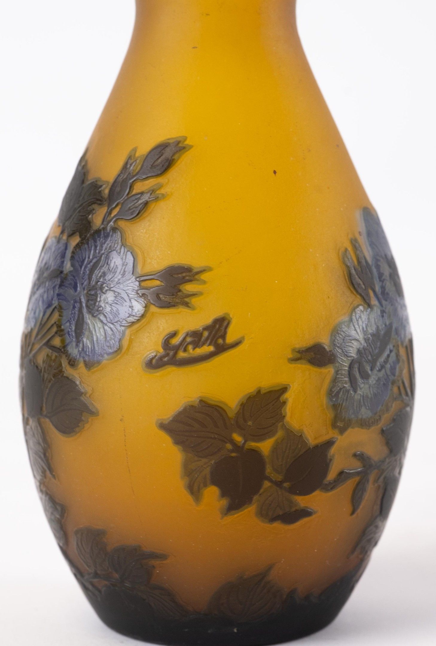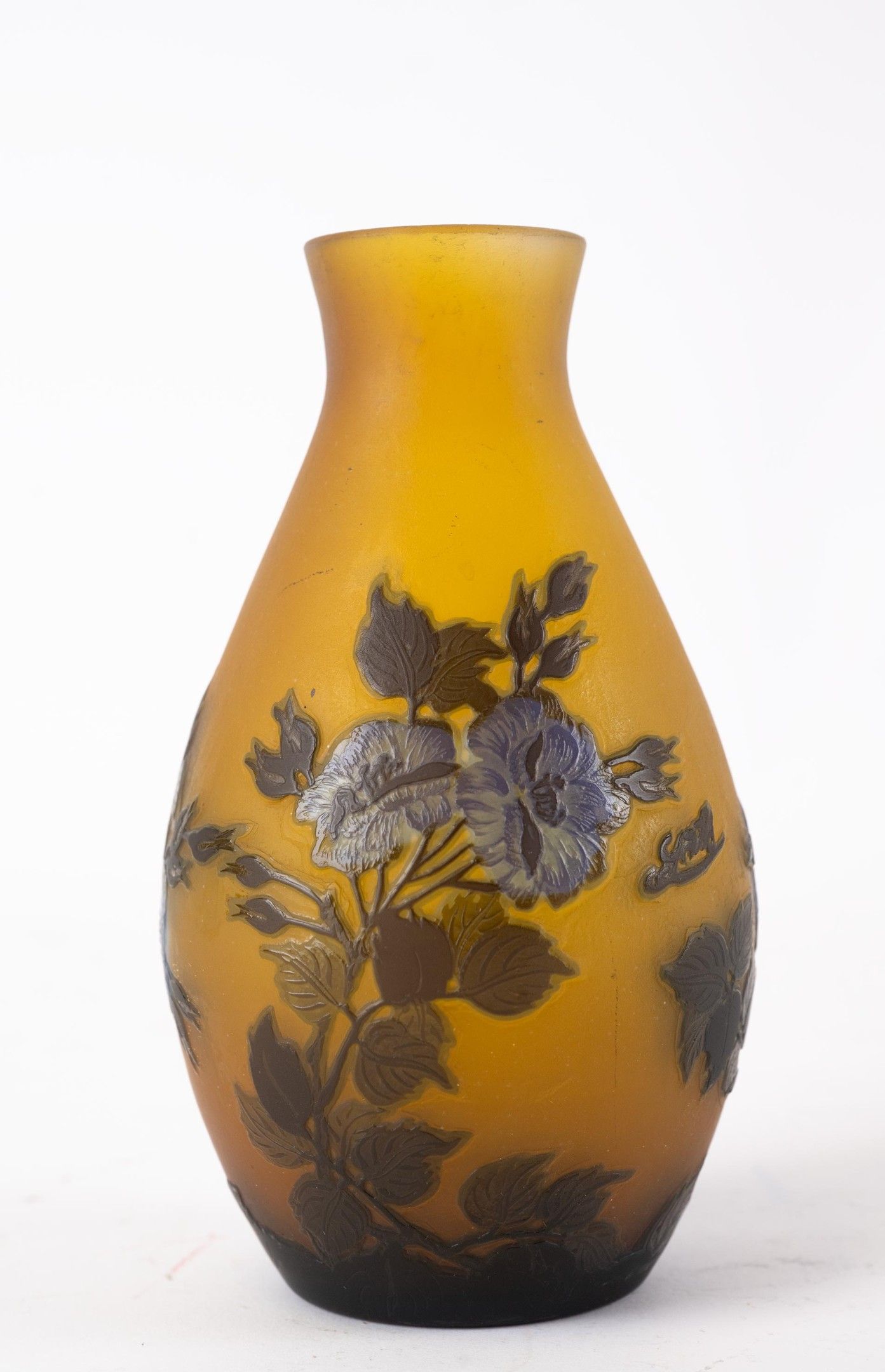 TIP - after GALLE, reproduction small baluster vase in multi-layered glass with yellow background and acid-etched flowers, signed in the decoration, H: 17 cm. Small chips to the neck.