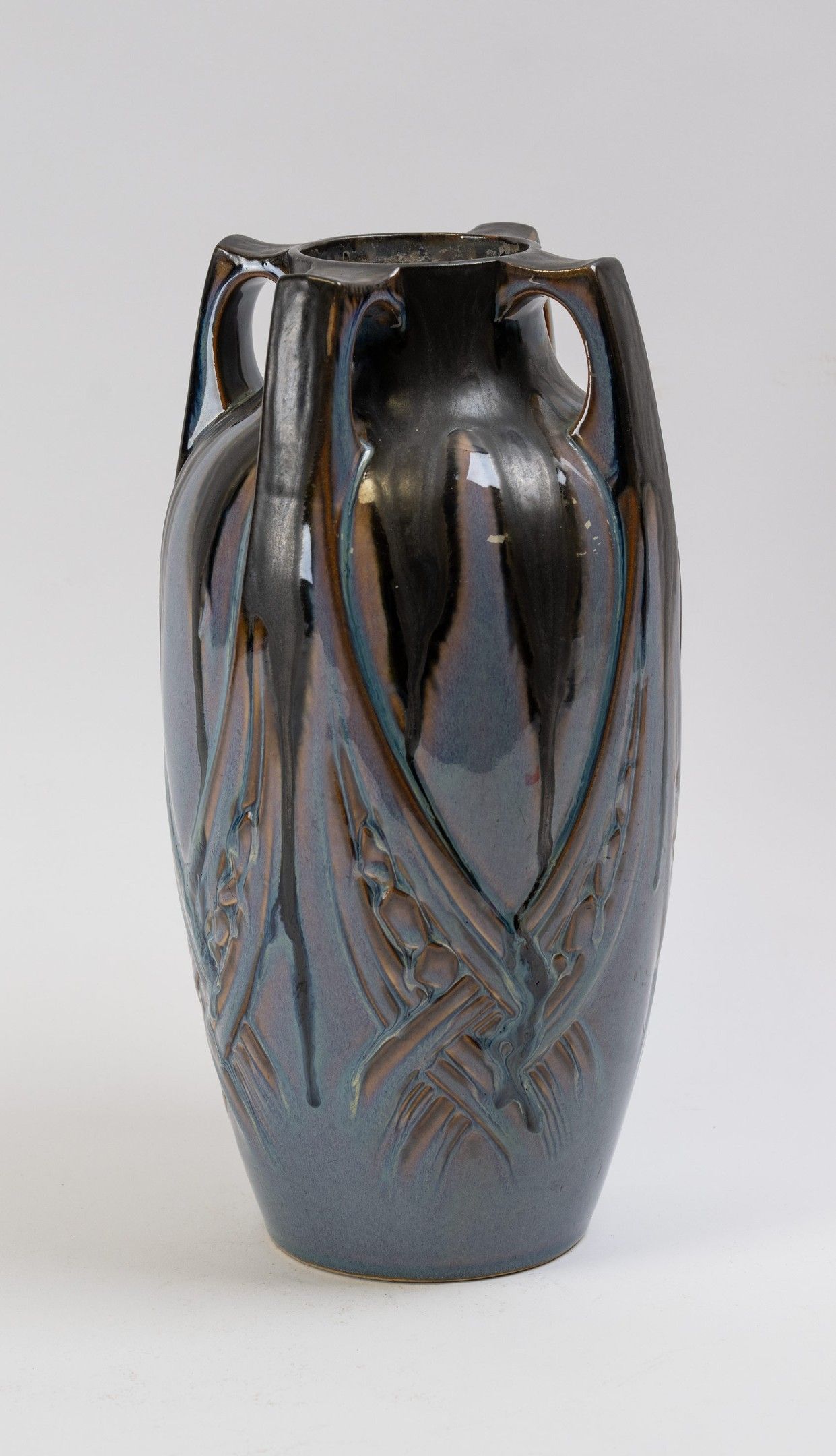 DENBAC, Four-handled vase in glazed stoneware with stylised foliage decoration, H: 33c m