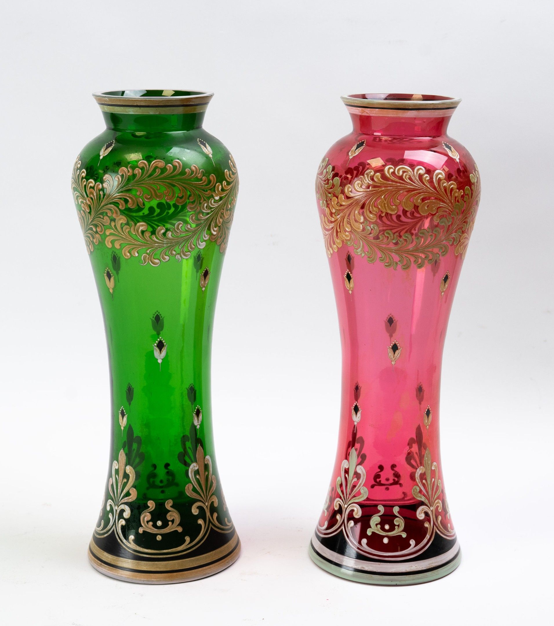 Pair of baluster-shaped vases in pink and green tinted blown glass, with enamelled decoration of foliage and flowers, H: 42 cm
