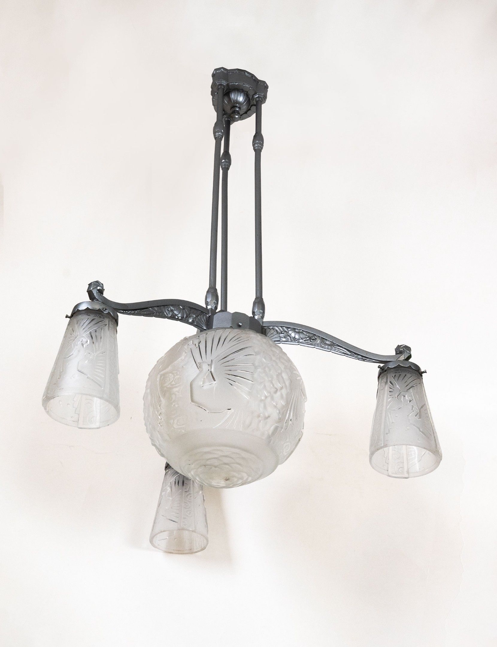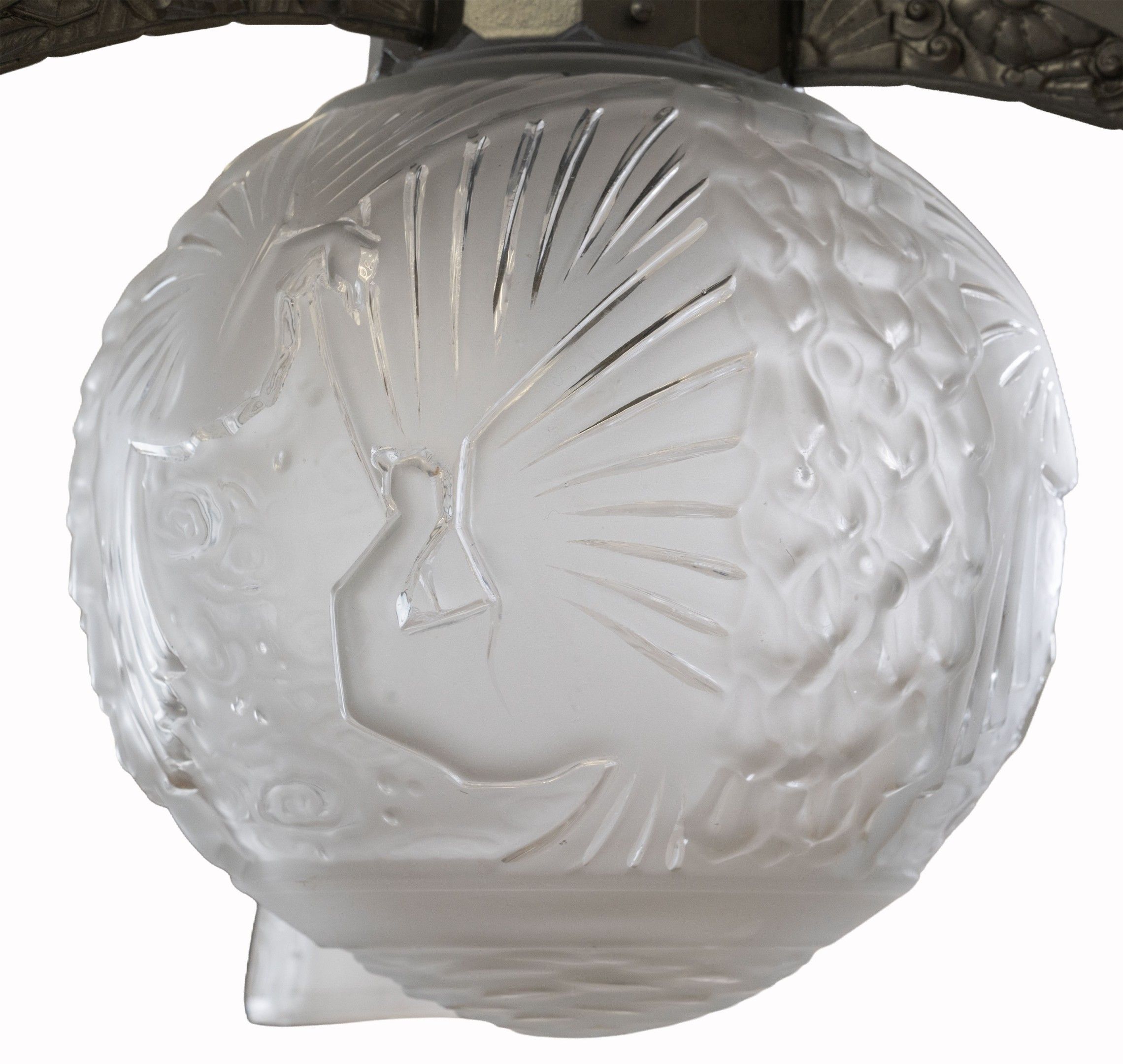 Hanging lamp in silver-plated metal with a central globe and three arms of light ending in pressed-moulded glass tulips, decorated with peacocks. Art Deco work, H:90 cm, W:55 cm
