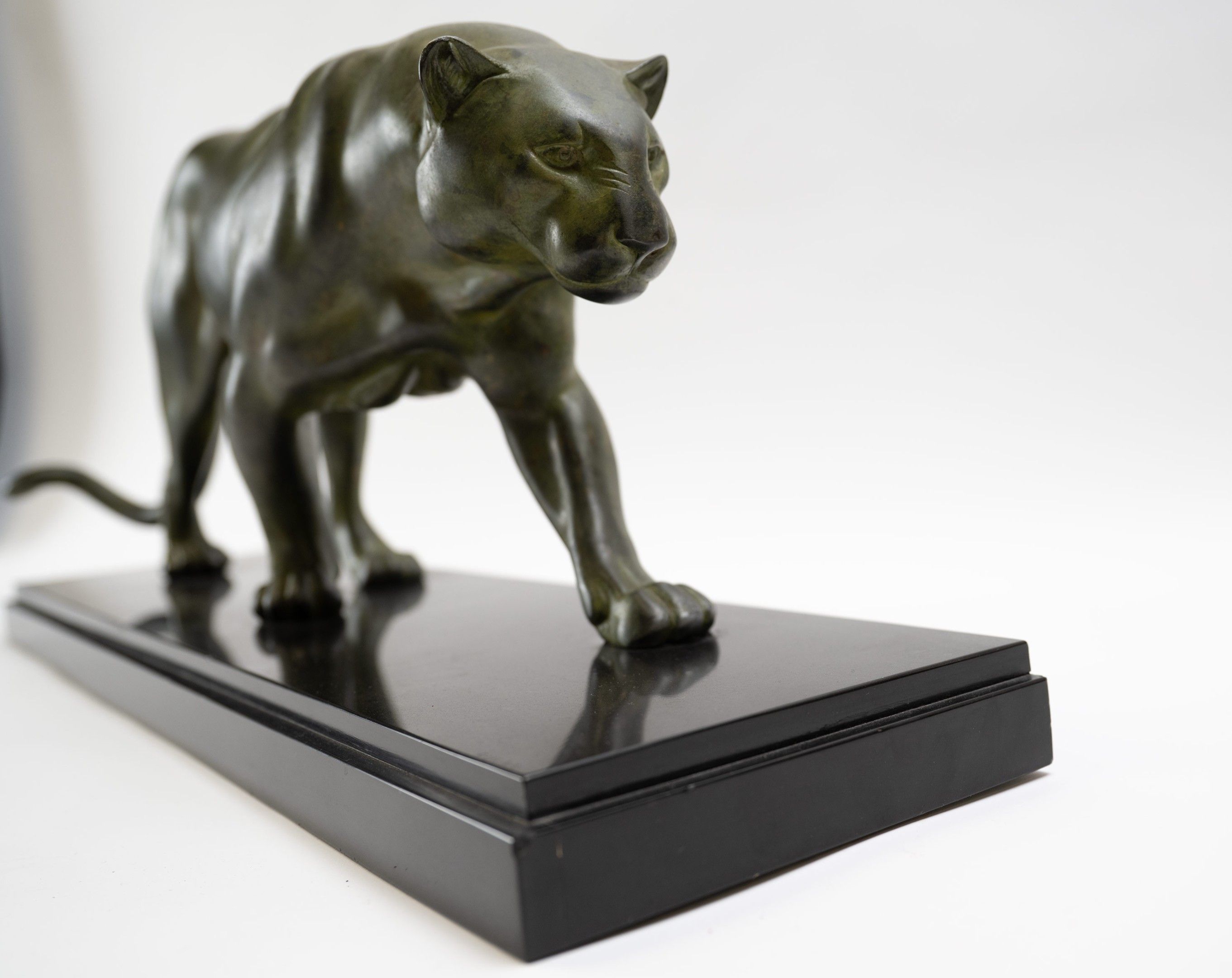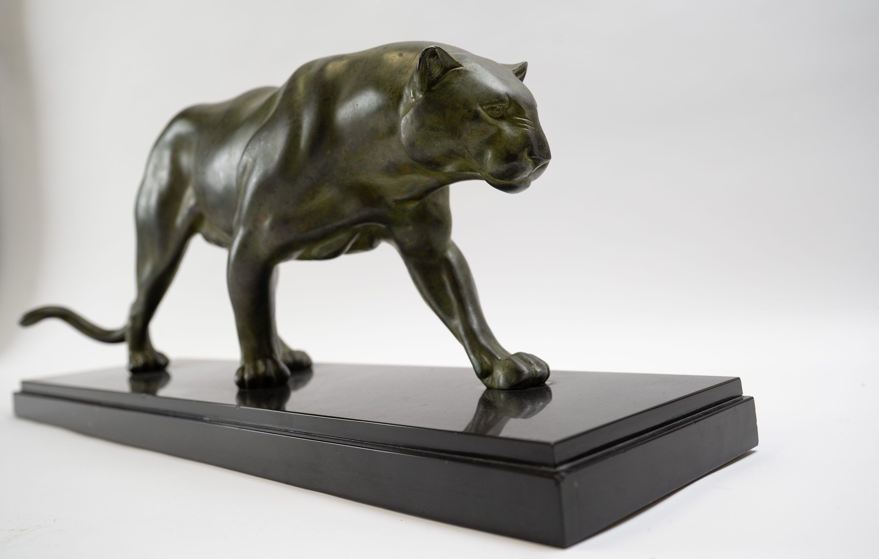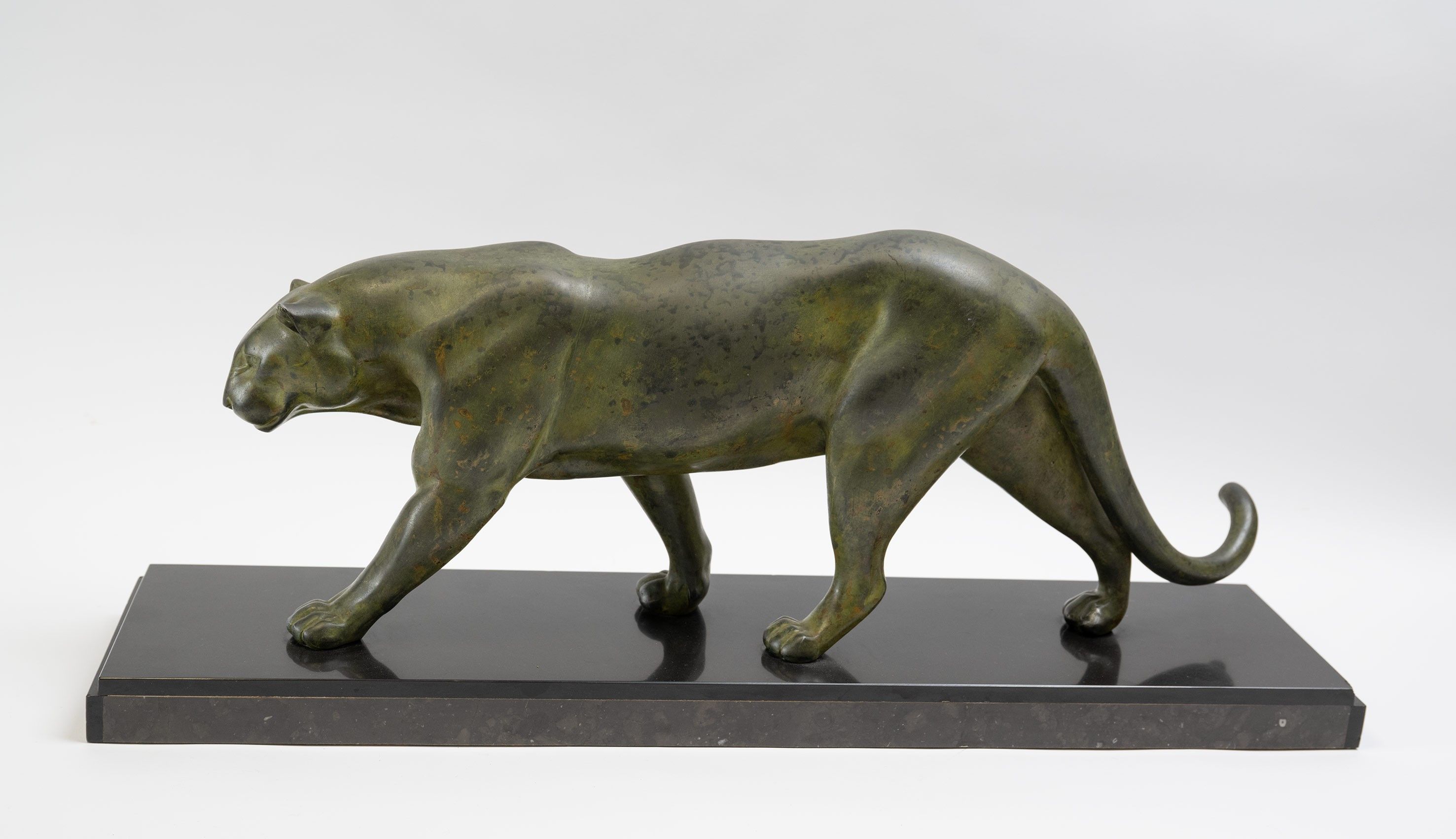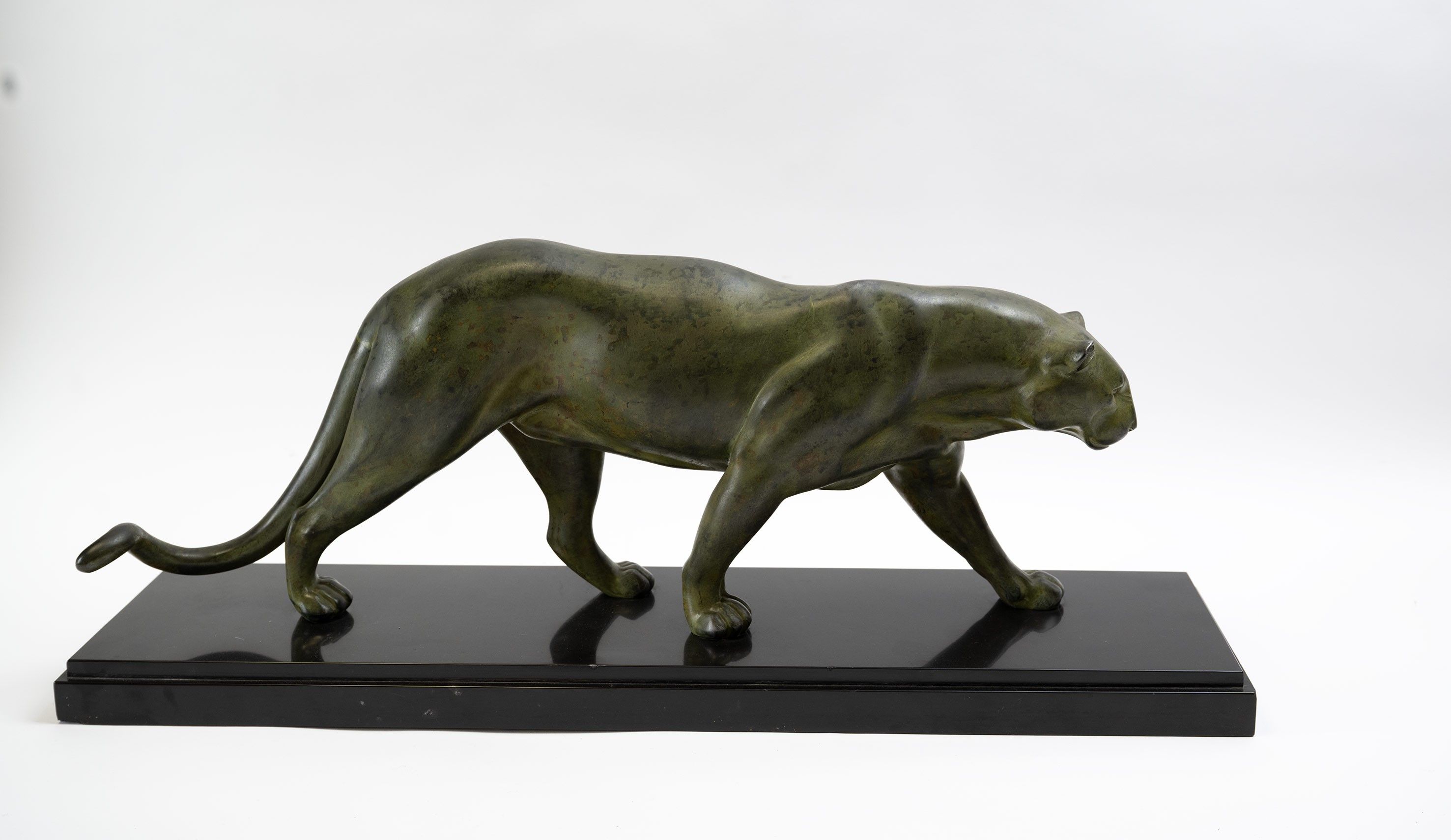 RULAS (XX), "Penthère marchant", Green patnié alloy, parangon marble base, signed, H: 29 cm, L: 72 cm, W: 18 cm