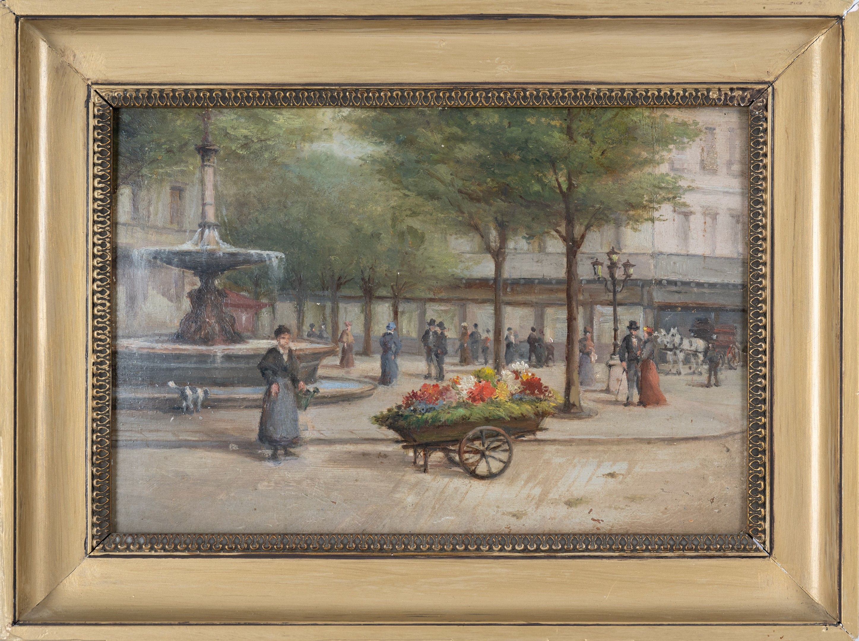Léonie LEBAS (XIX-XX), "La marchande de fleurs", oil on cardboard, H: 22 cm, W: 32 cm