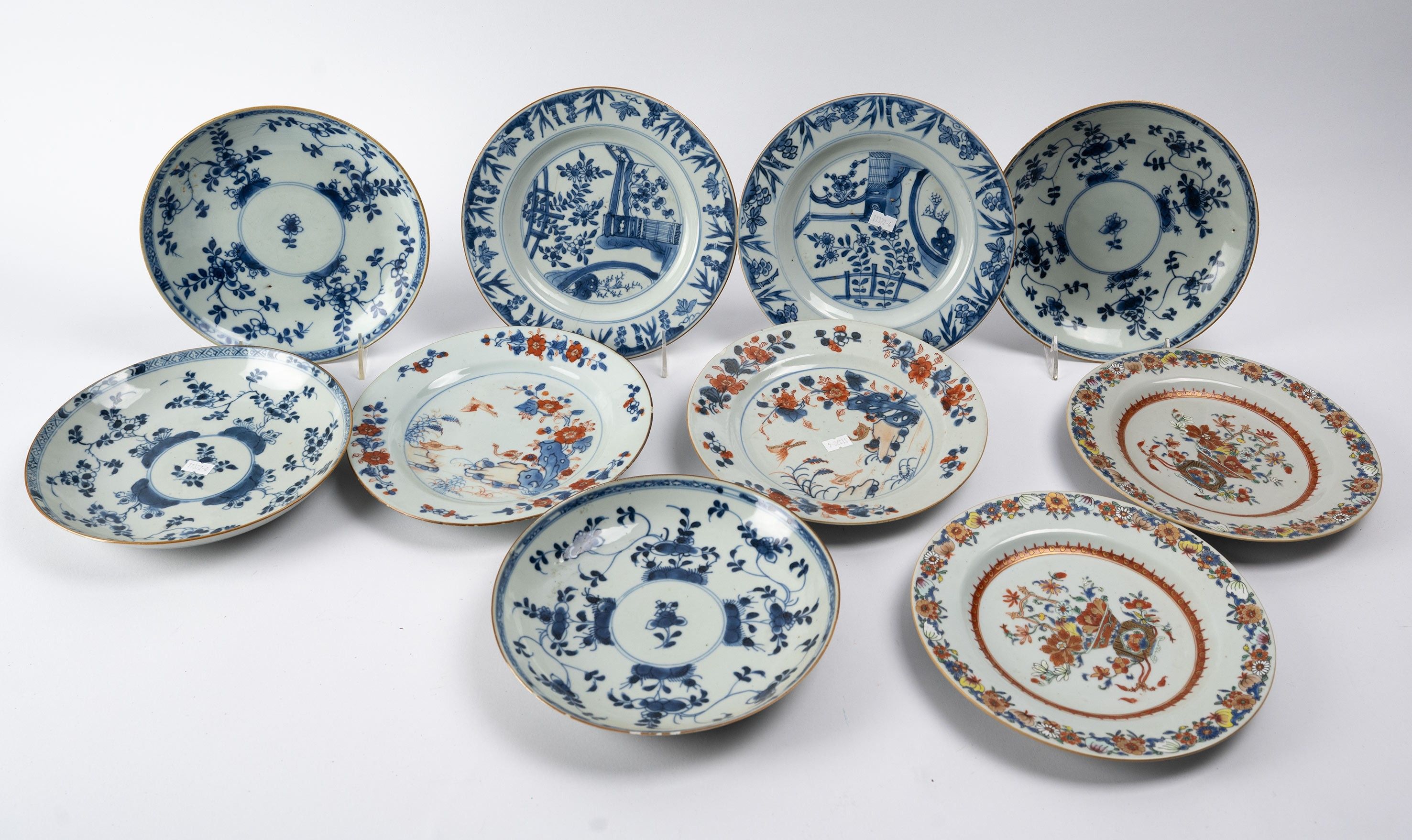 18th and 19th century China and Japan, 4 blue and white porcelain round and soup plates, 2 Compagine des Indes dinner plates, 4 Imari porcelain plates