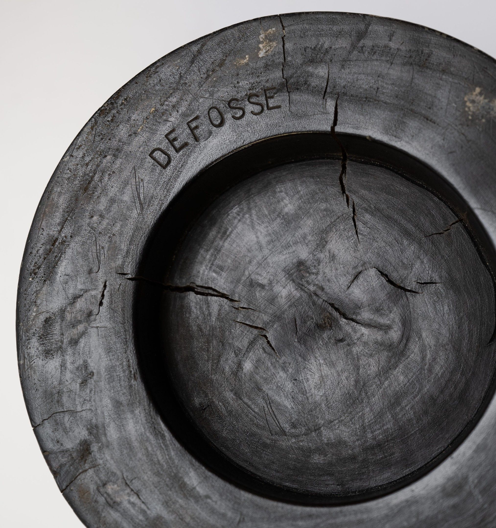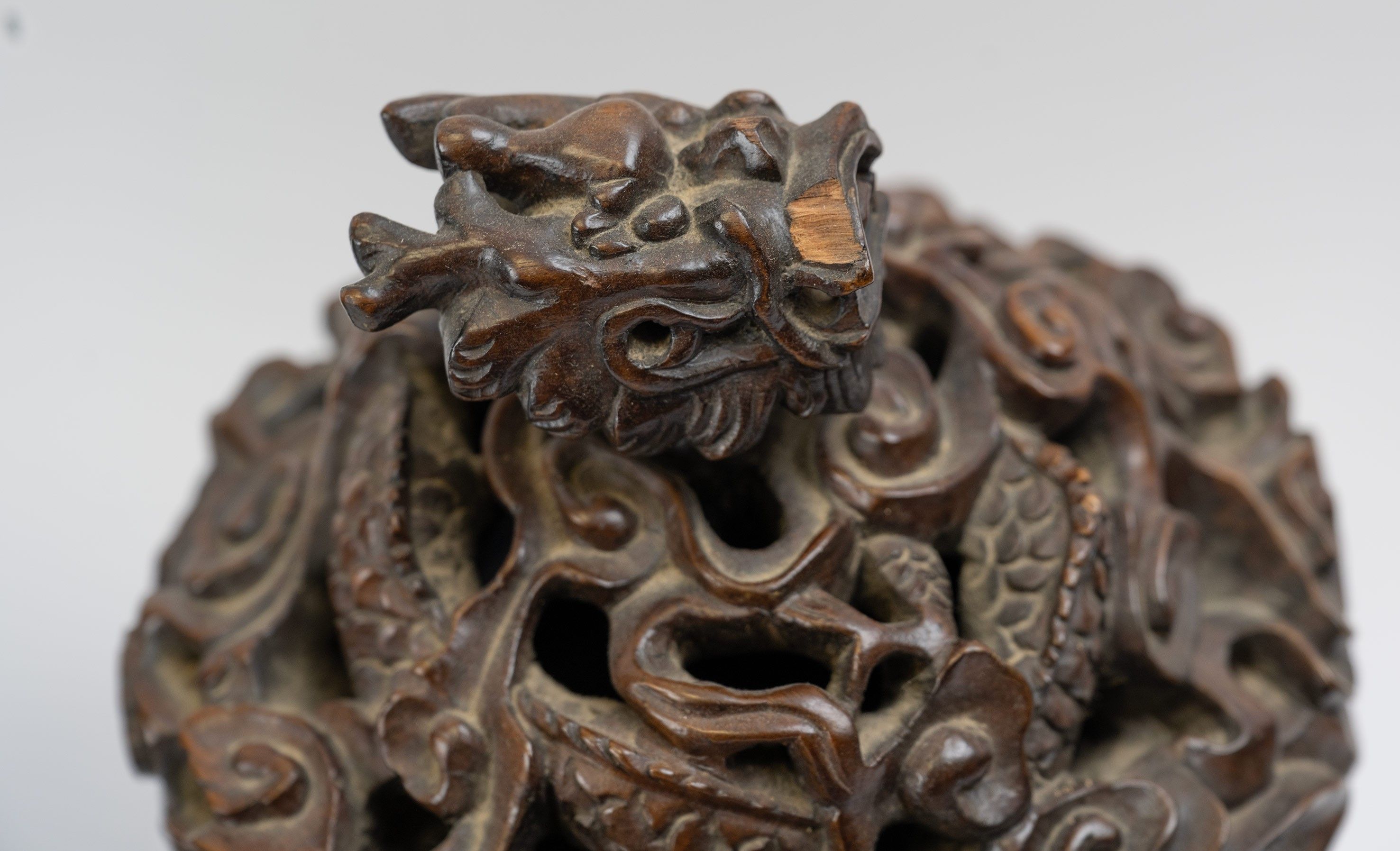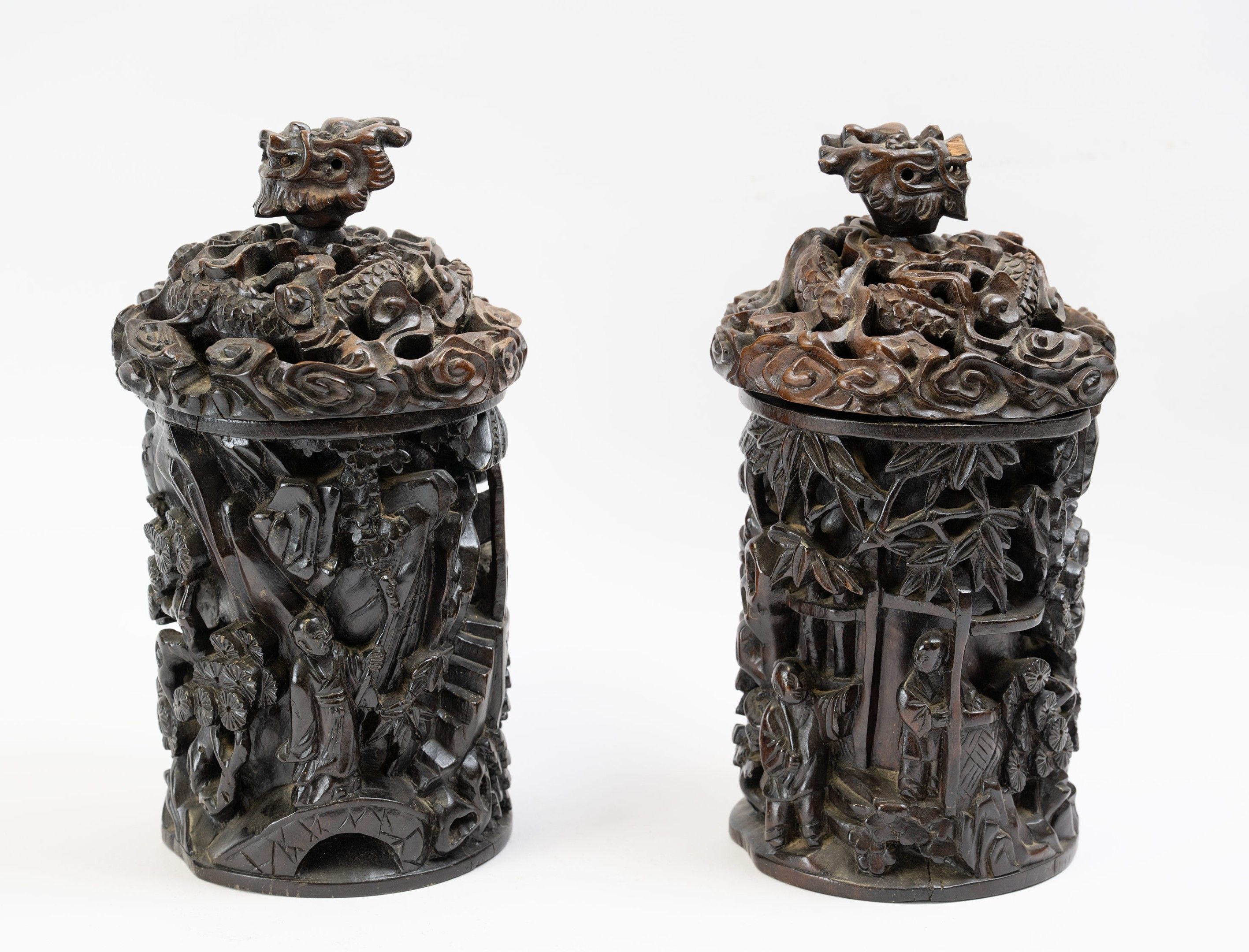 A pair of carved wooden covered pots with a dark brown patina and carved figures in relief among buildings and trees.