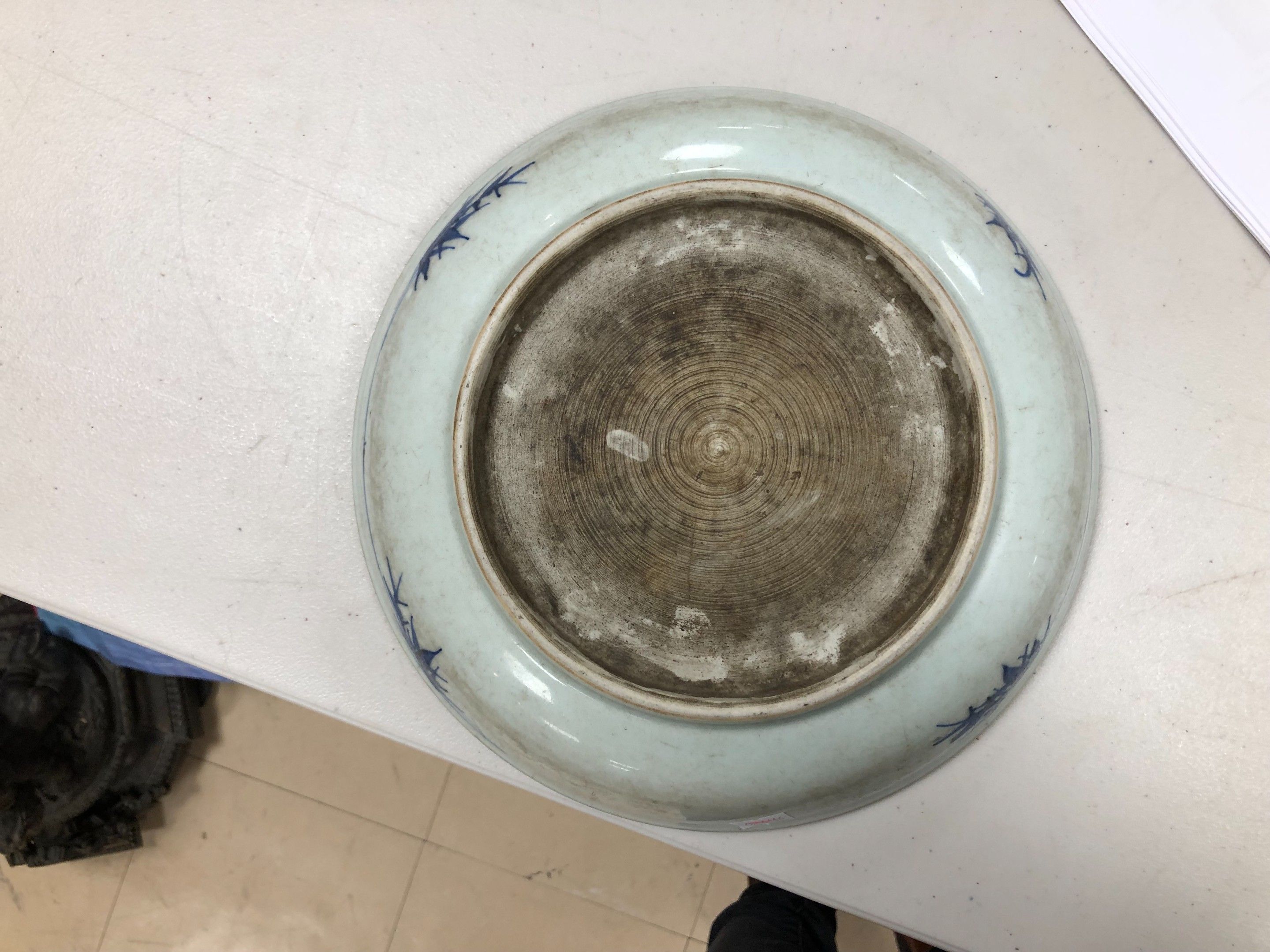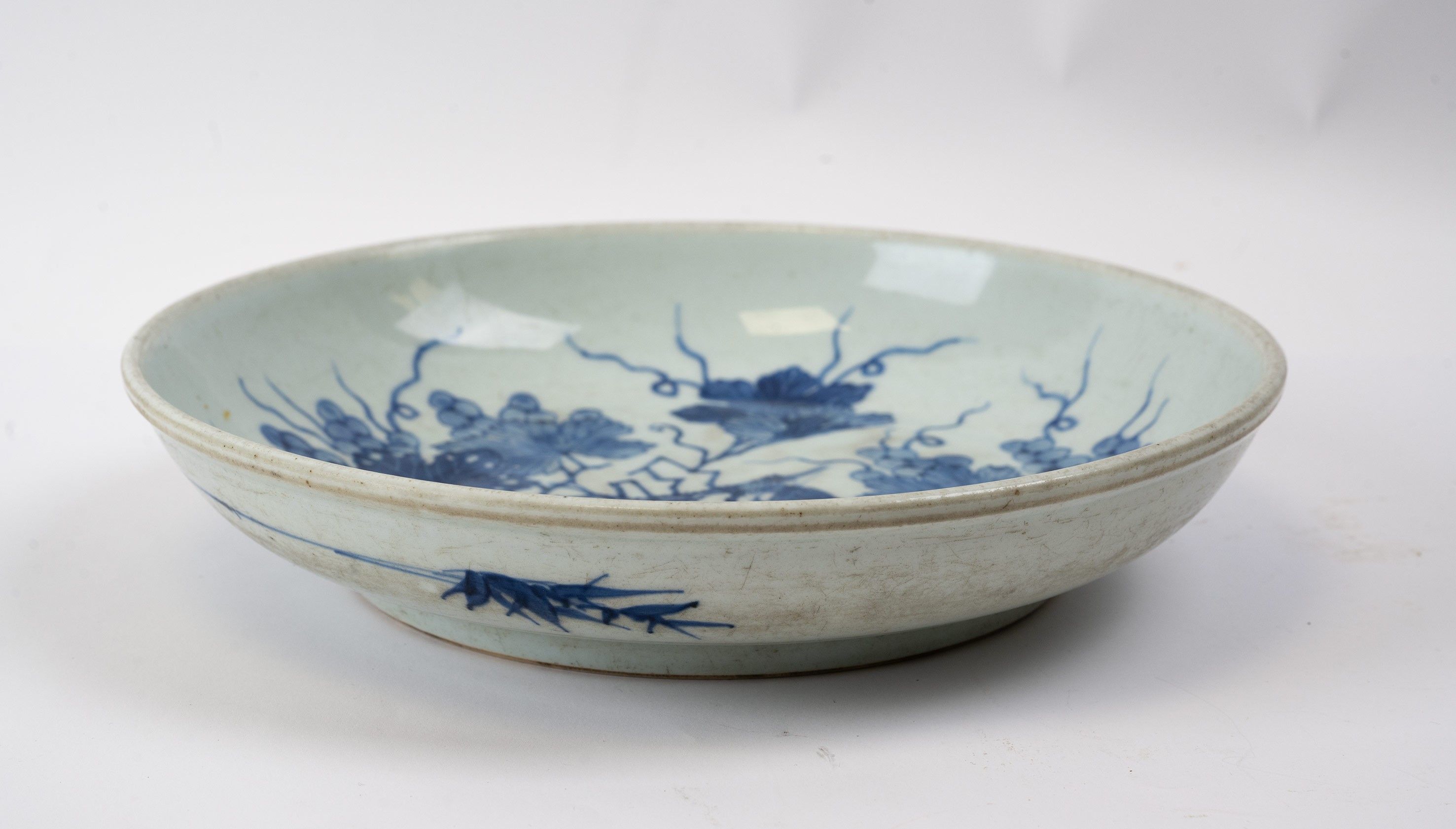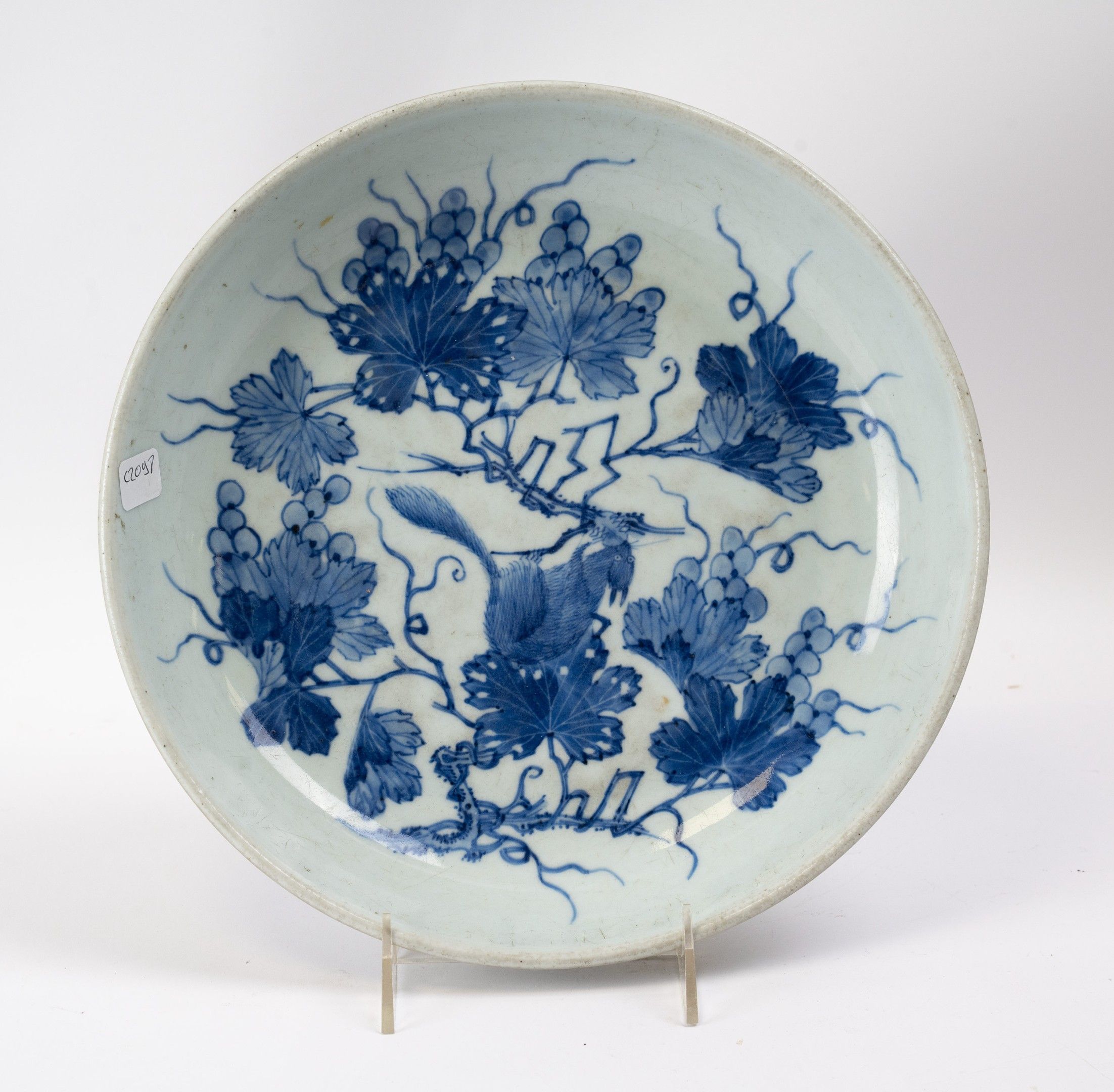 China 19th c, Round hollow dish in white porcelain with blue decoration of a squirrel on branches, D: 28 cm, wear to the cover on the bottom
