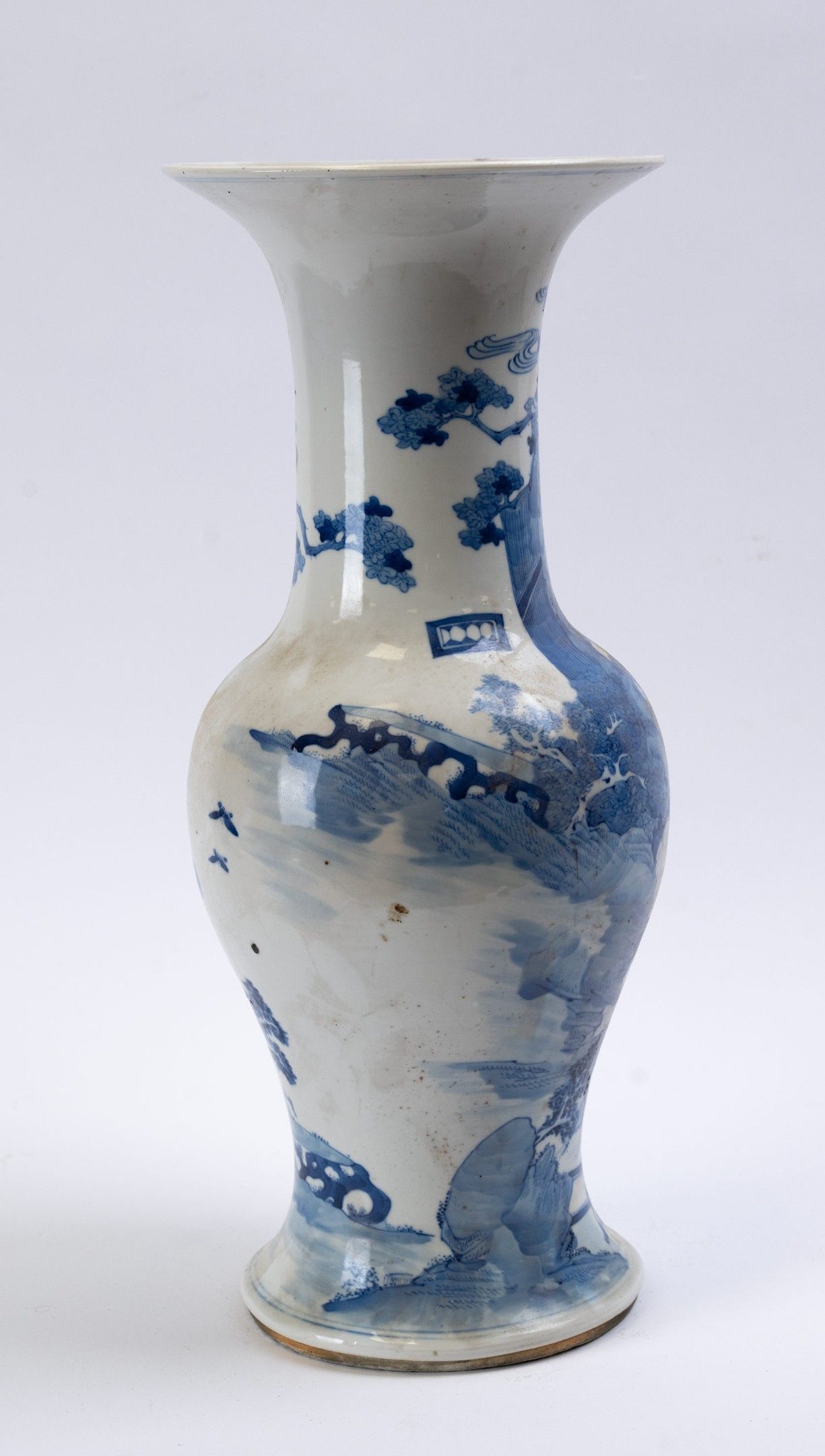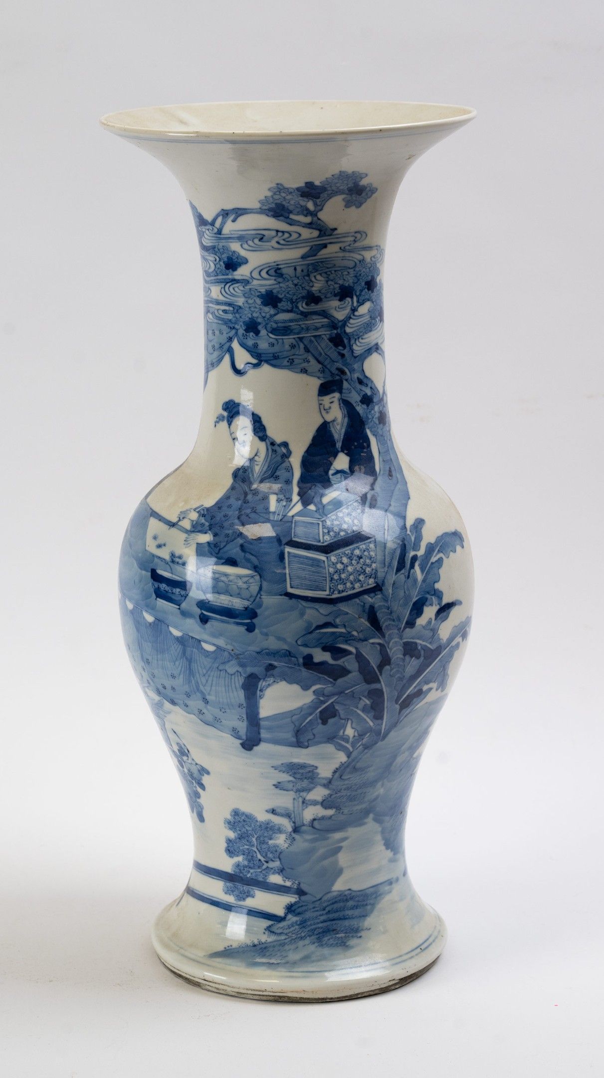 A "yenyen" shaped porcelain vase with a curved base, swollen shoulder and long neck flared at the opening, decorated in blue and white with three figures in a shrubby landscape.