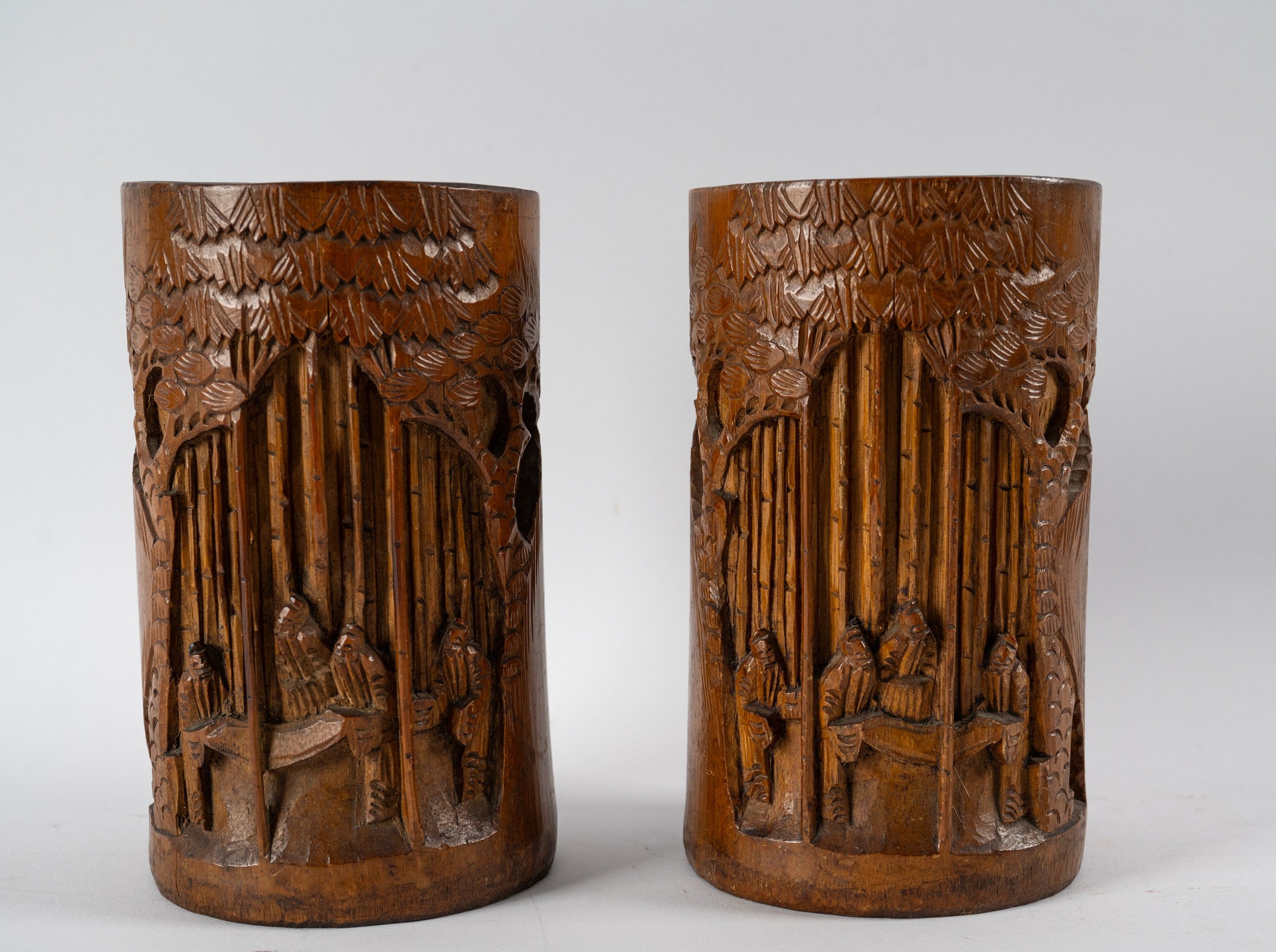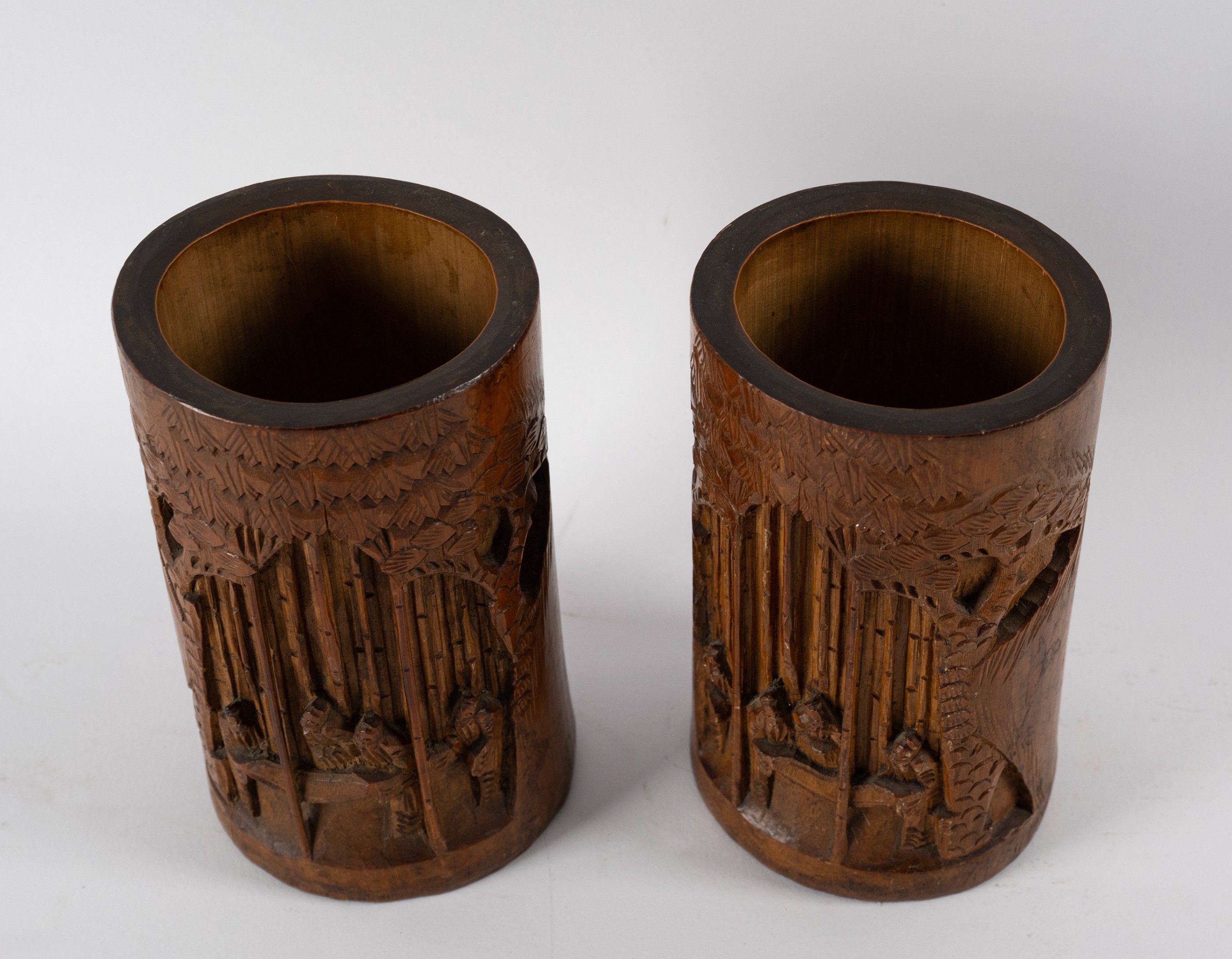 Pair of carved bamboo brush pots decorated with a bamboo forest, H: 18 cm