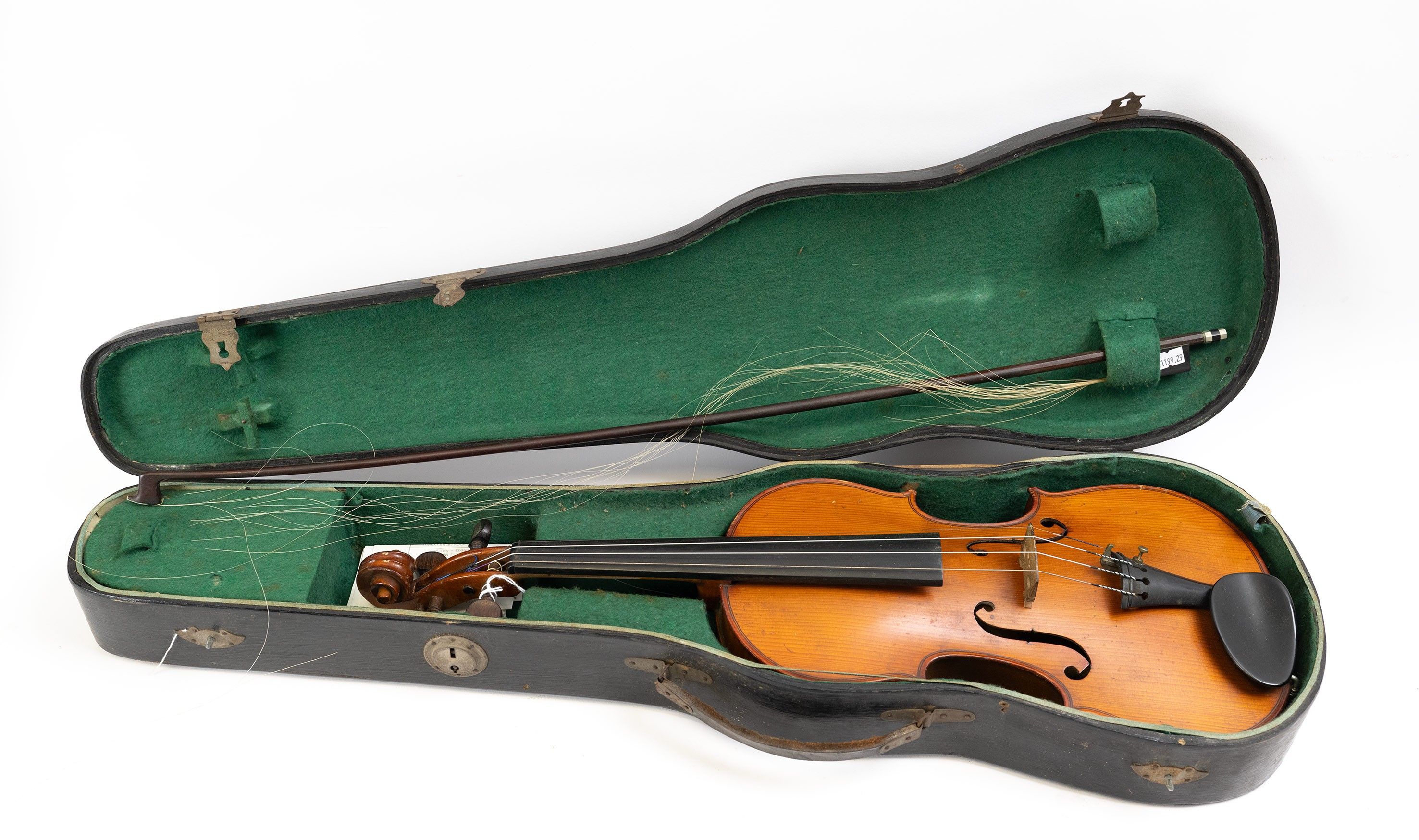 Student violin, bearing a Giovann Paolo Maggini label, made in Brescia 1637. L : 356 mm. Minor wear. In its case, with bow, L: 74 cm