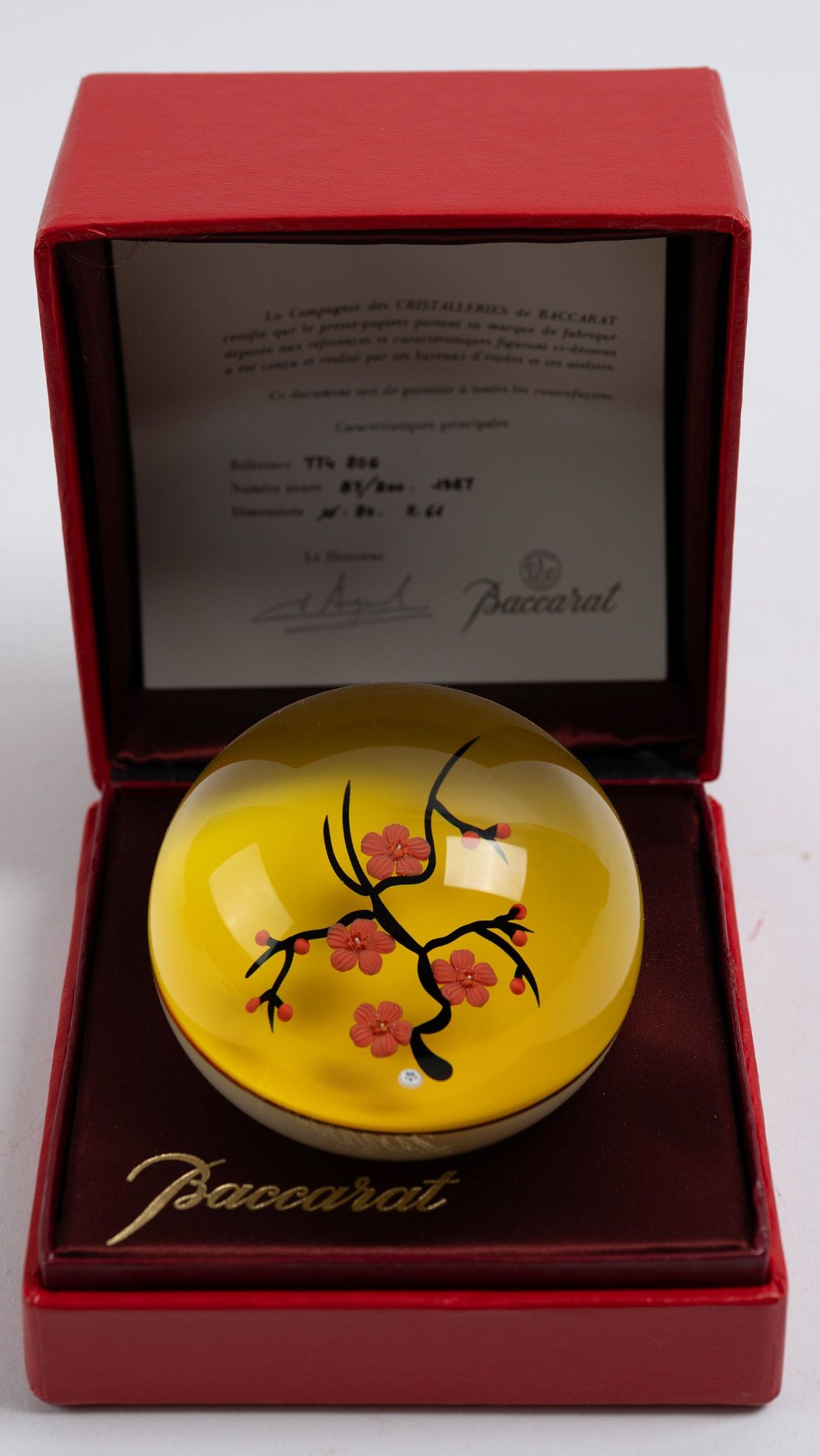 BACCARAT, crystal paperweight, Bonzaï Pommier pink flowers on yellow background, 1987, ref : 774 806, justified 87/200, D : 80 mm, H : 61 mm, in its box