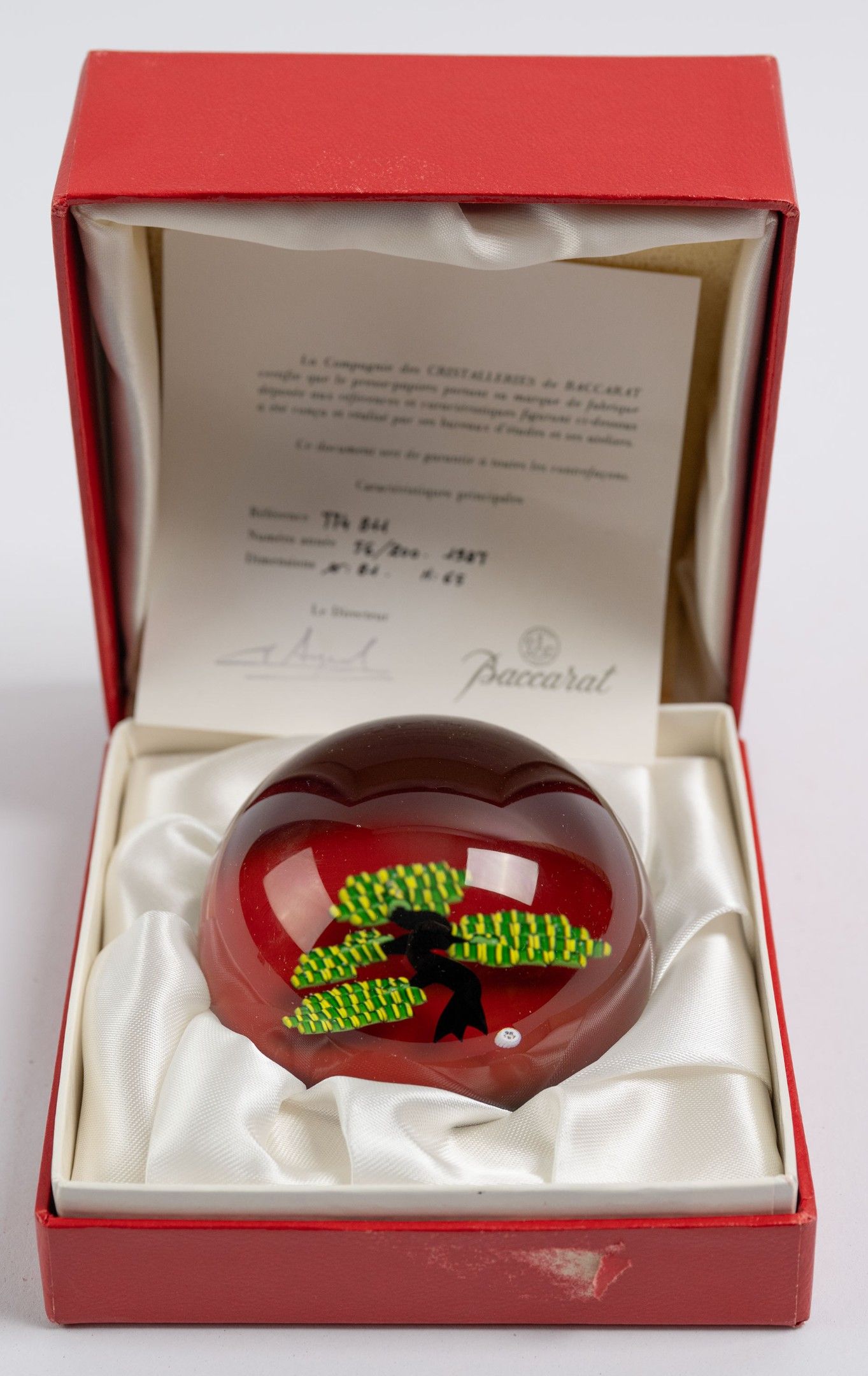 BACCARAT, crystal paperweight ball, Bonzaï on yellow background, 1987, ref: 774 811, justified 56/200, D: 81 mm, H: 65 mm, in box with certificate