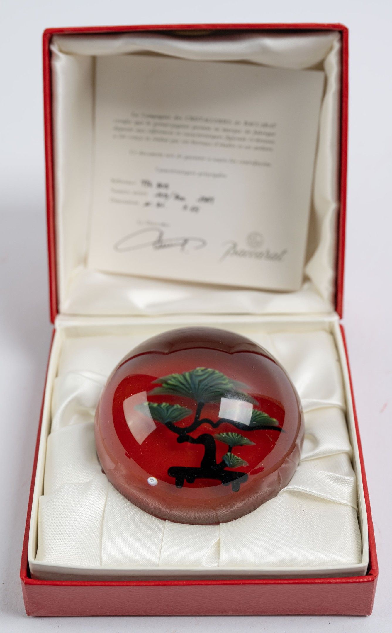 BACCARAT, crystal paperweight ball, Bonzaï on red background, 1987, ref: 774 809, justified 159/200, D: 81 mm, H: 65 mm, in box with certificate