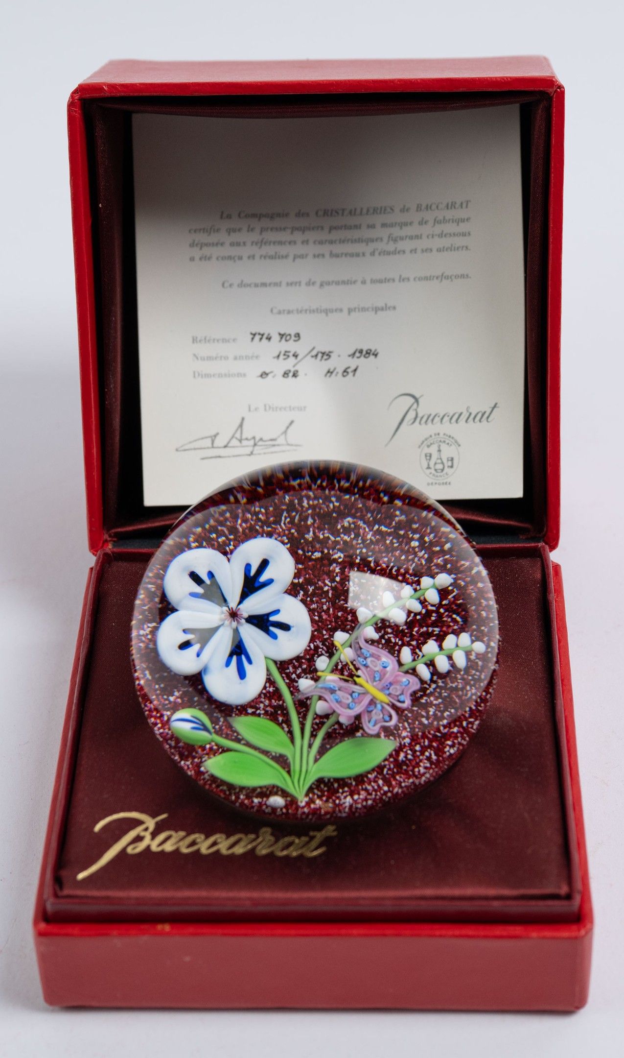 BACCARAT, crystal paperweight ball, white flower with blue heart and pink and blue butterfly, 1984, ref: 774 709, justified 154/175, D: 82 mm, H: 61 mm, in box with certificate