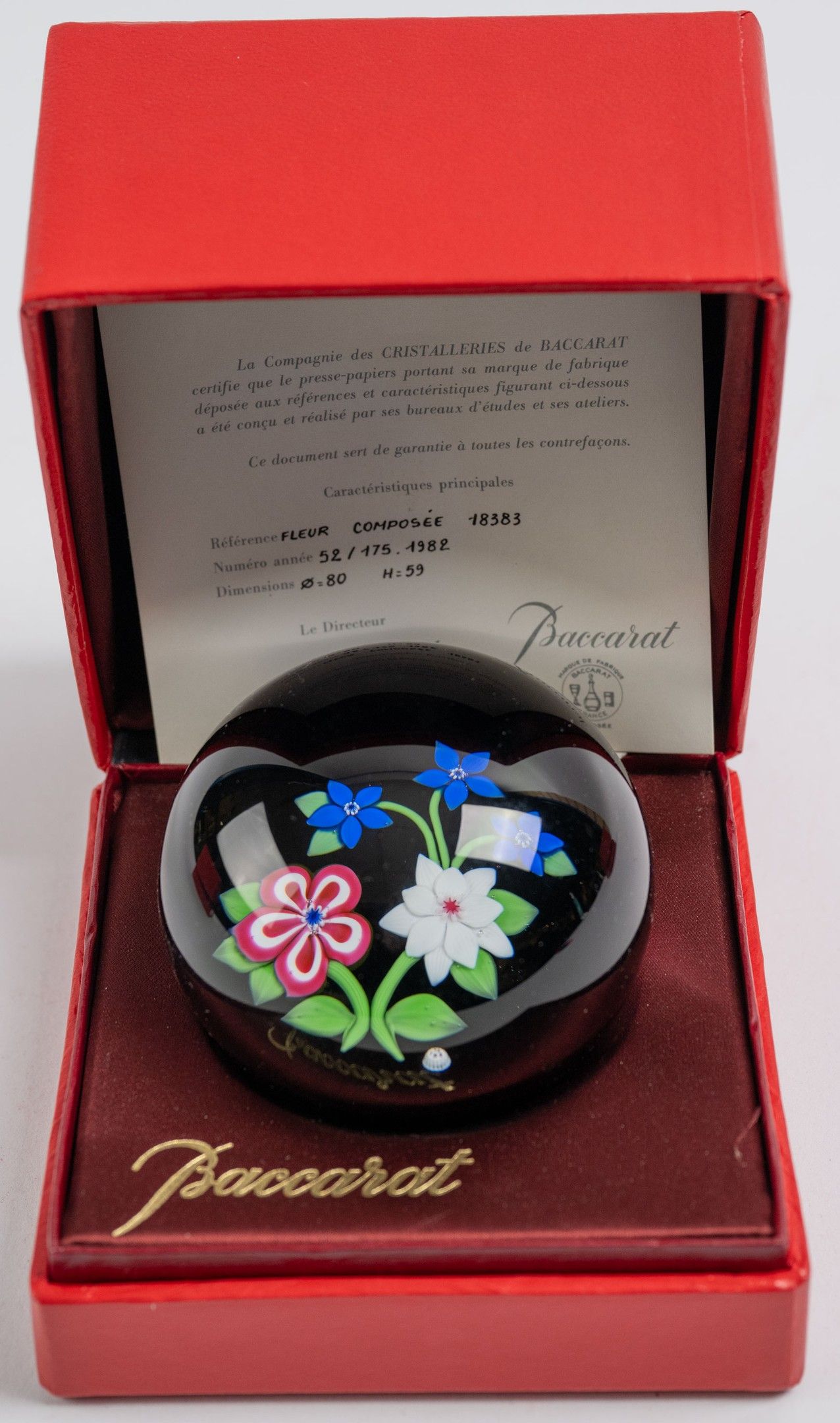 BACCARAT, crystal paperweight, blue, white and red compound flowers, 1982, ref: 18383, justified 52/175, D: 80 mm, H: 59 mm, in box with certificate