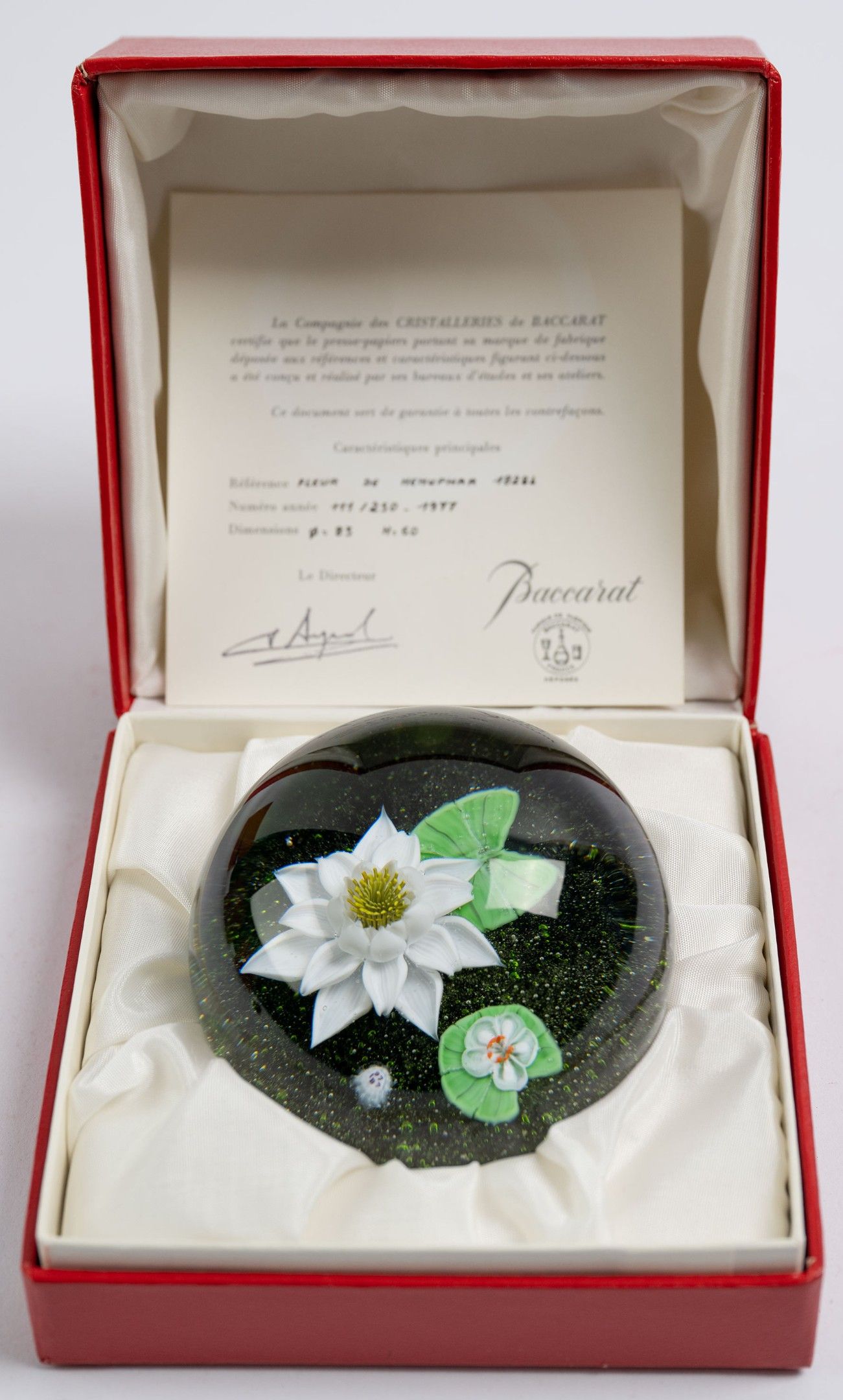 BACCARAT, crystal paperweight ball, Fleurs de nénuphars, 1977, ref: 18284, justified 111/250, D: 83 mm, H: 60 mm, in box with certificate