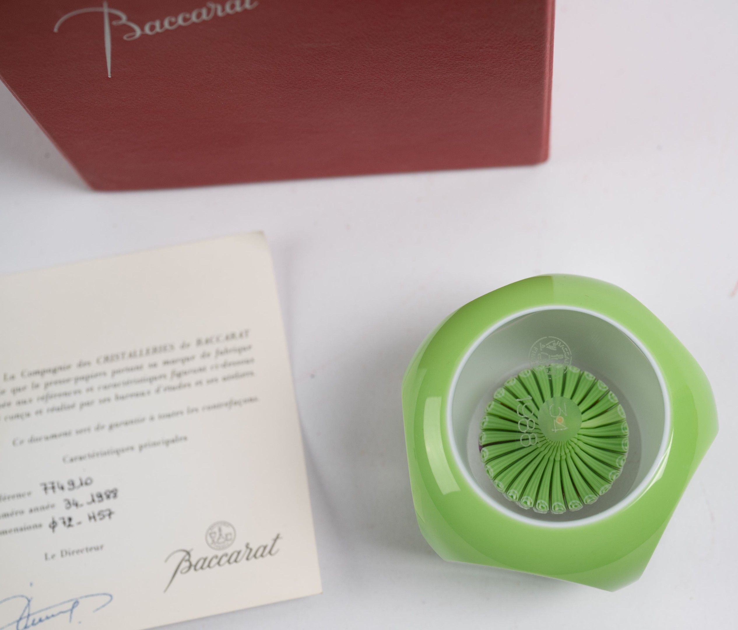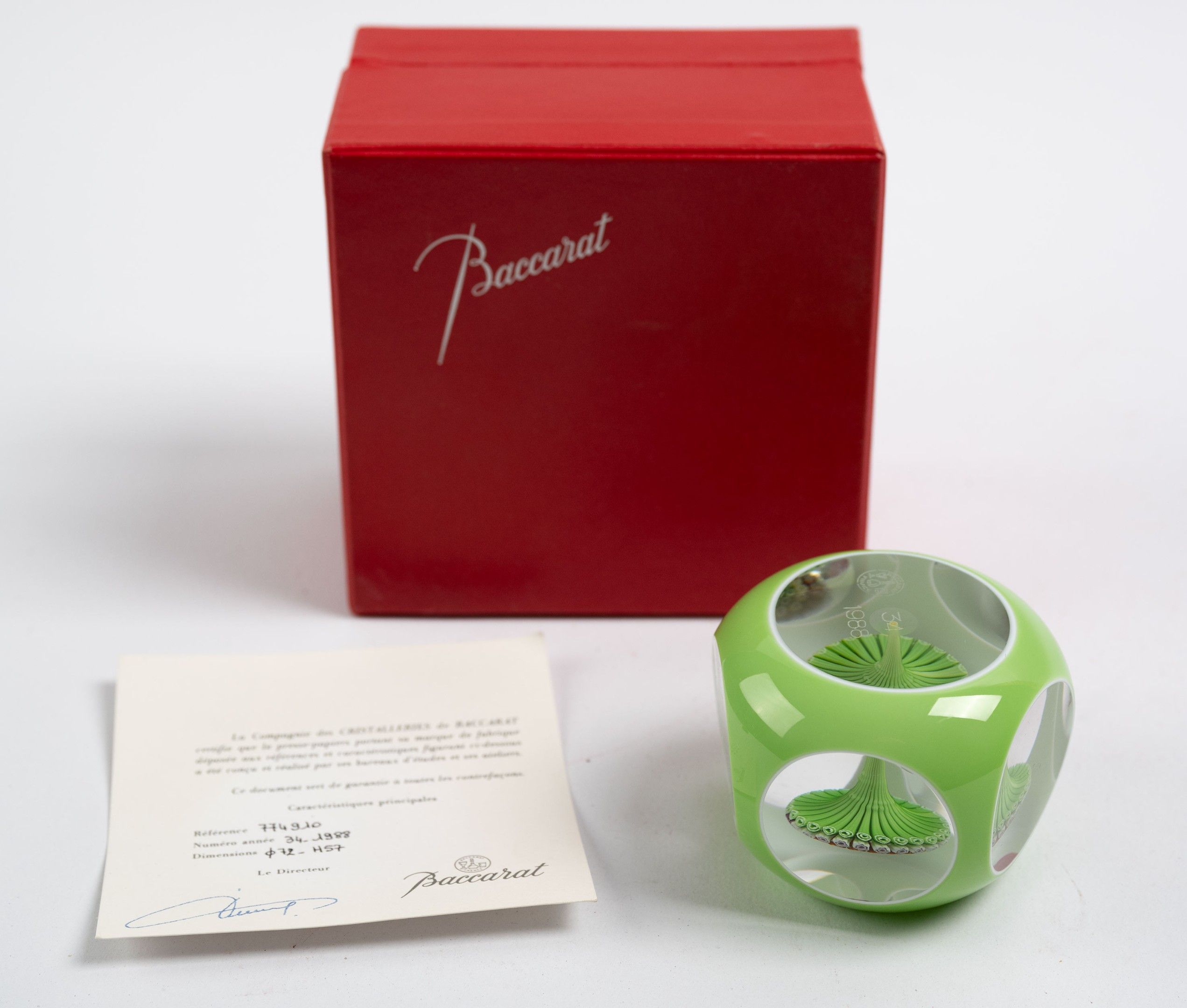 BACCARAT, crystal paperweight ball, green overlay and millefiori, 1988, ref: 774/910, justified 34, D: 72 mm, H: 57 mm, in box with certificate