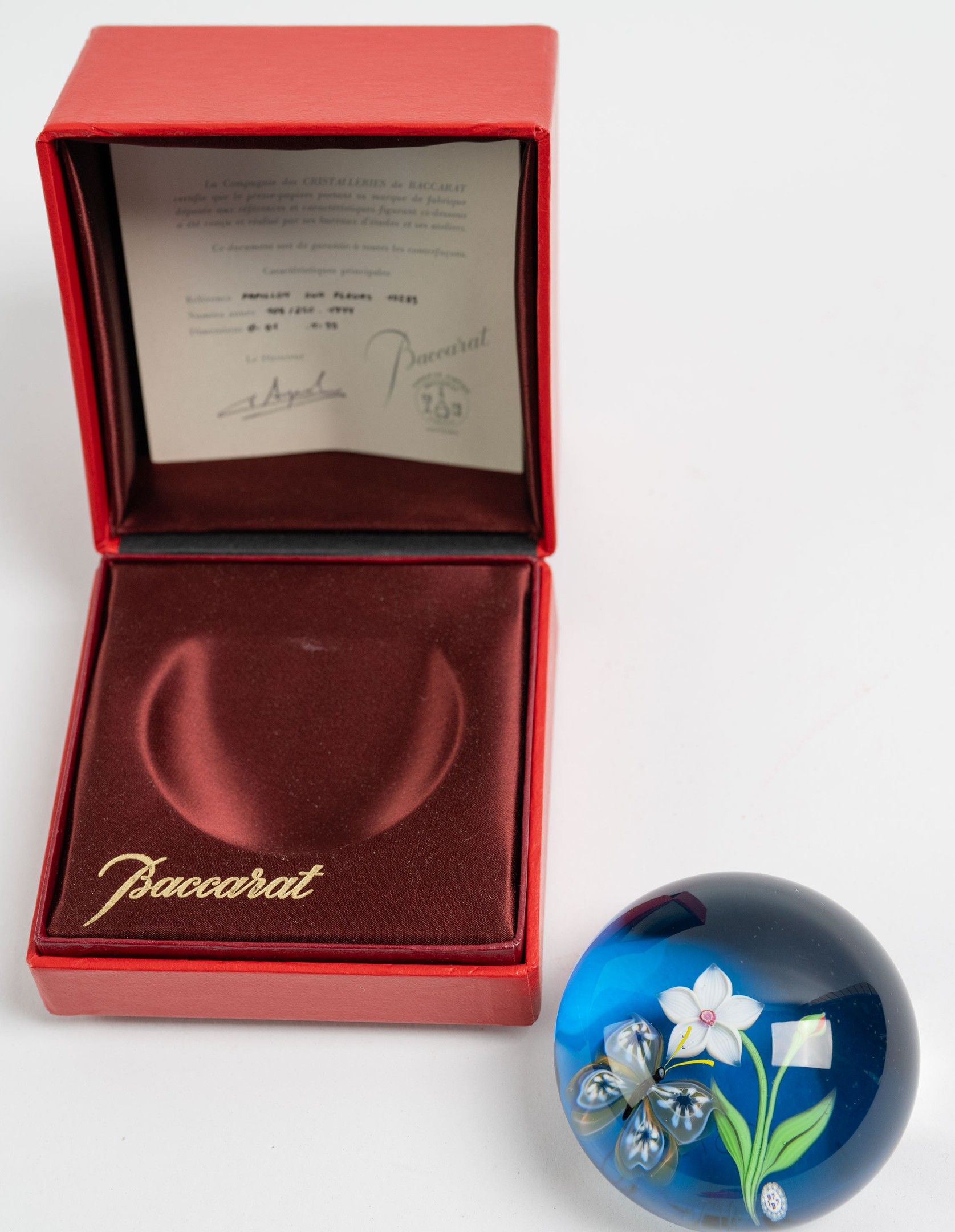 BACCARAT, crystal paperweight ball, blue butterfly on white flower, 1977, ref: 18283, justified 103/250, D: 81 mm, H: 55 mm, in box with certificate