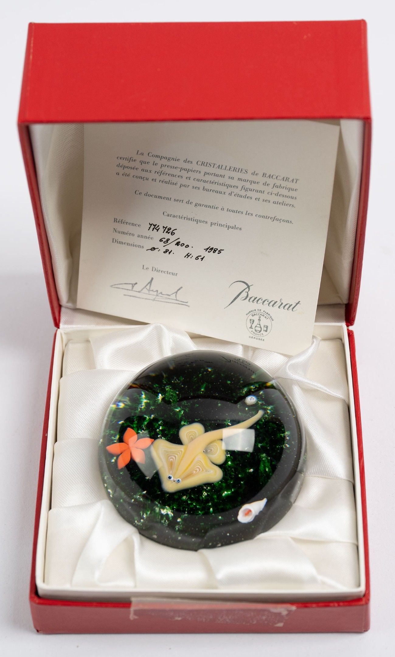 BACCARAT, crystal paperweight, sea background with beige ray, star and shell, 1985, ref: 774 726, justified 68/200, D: 81 mm, H: 61 mm, in box with certificate
