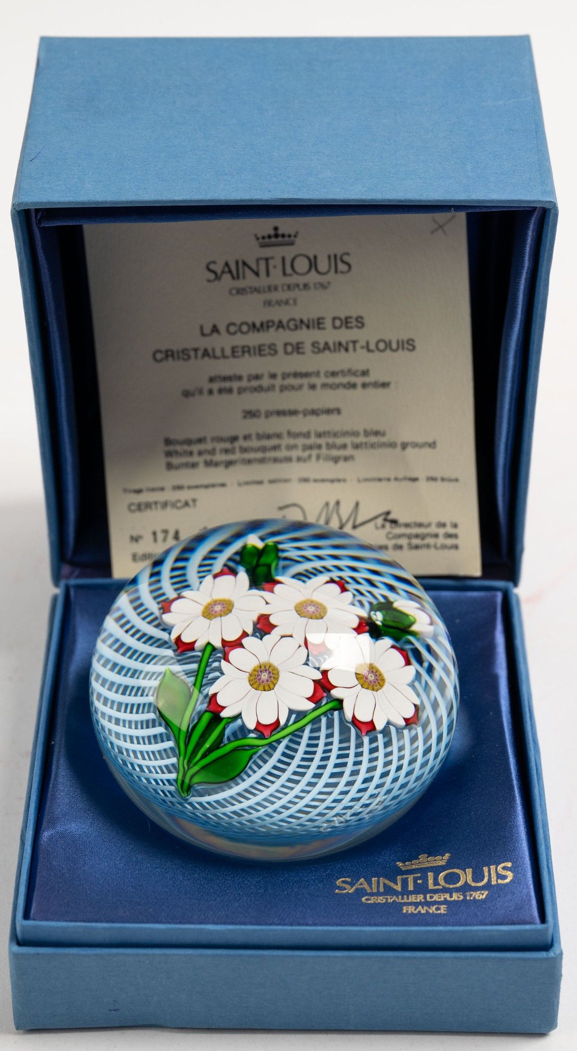SAINT LOUIS, crystal paperweight, Red and white bouquet on white latticinio background, 1985, justified 174/250, in box with certificate