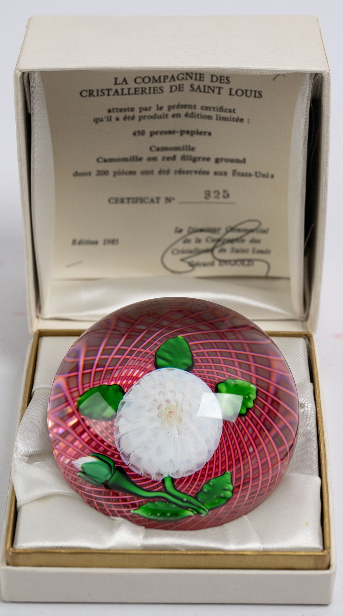 SAINT LOUIS, crystal paperweight, Camomile on pink filigree, 1983, justified 325/450, in box with certificate