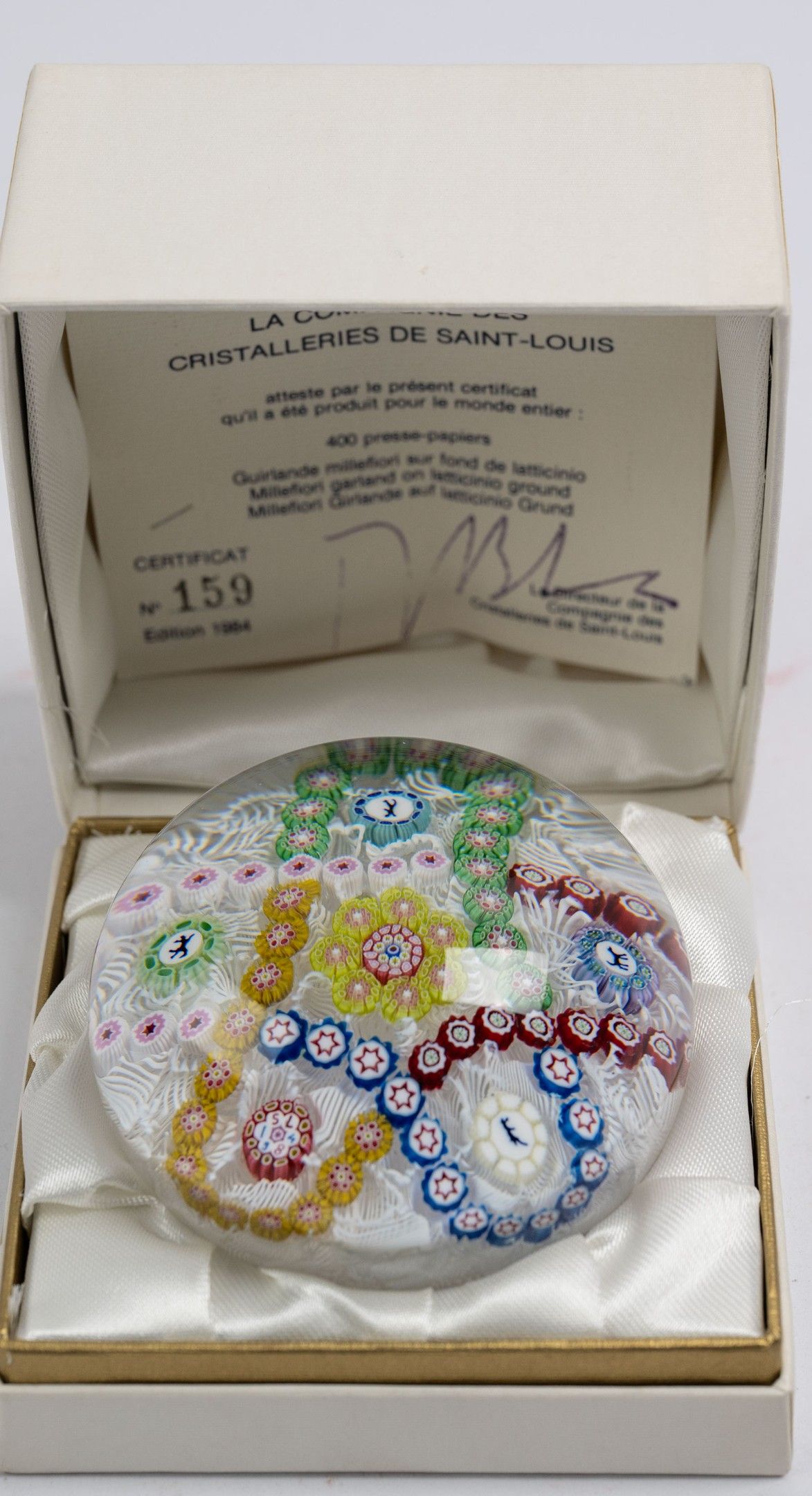 SAINT LOUIS, crystal paperweight ball, millefiori garland on Latticinio background, 1984, justified 159/400, in box with certificate