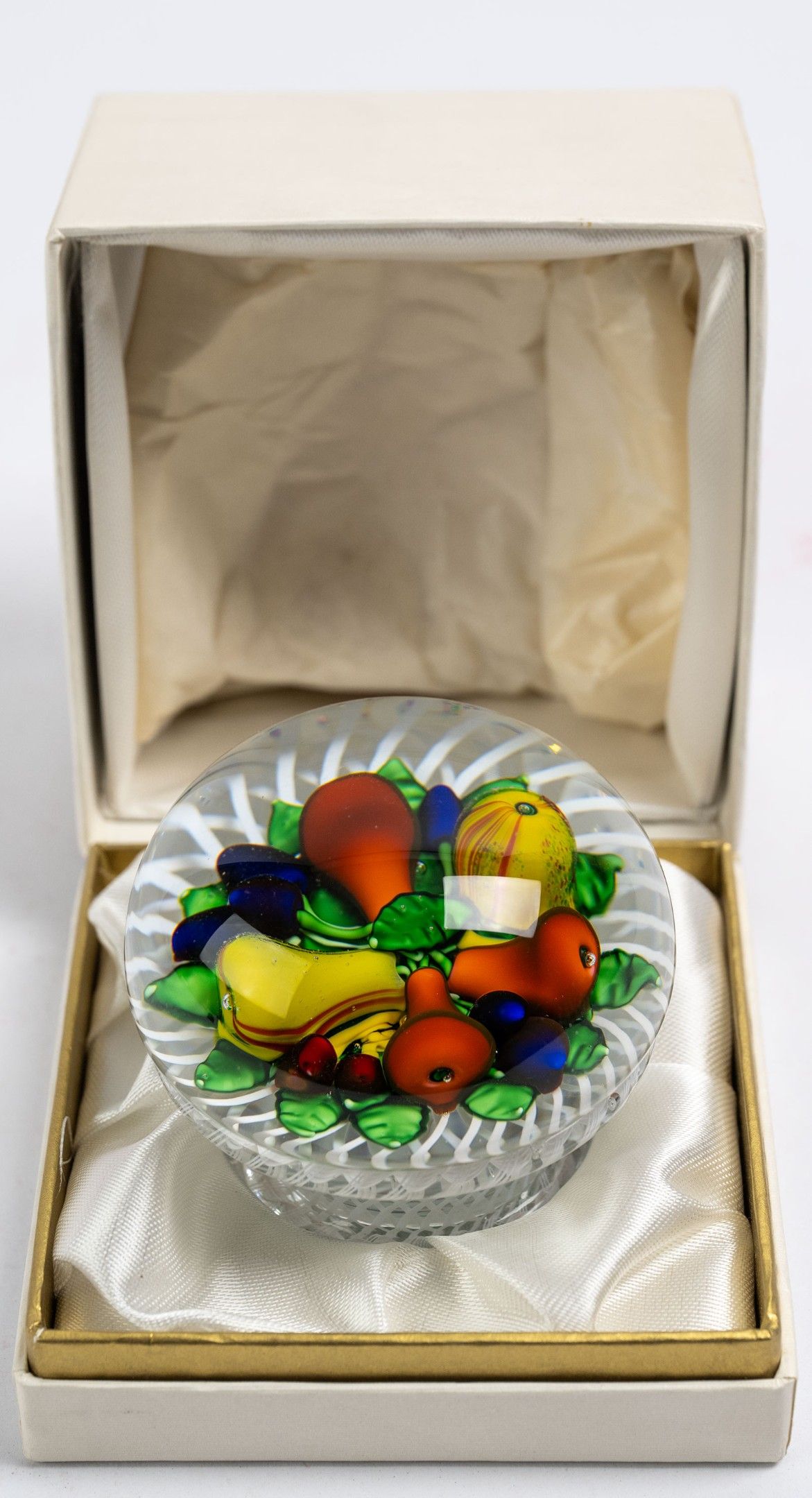 SAINT LOUIS, paperweight ball in the shape of a crystal basket, Basket of pears and apples on white filigree, in its box