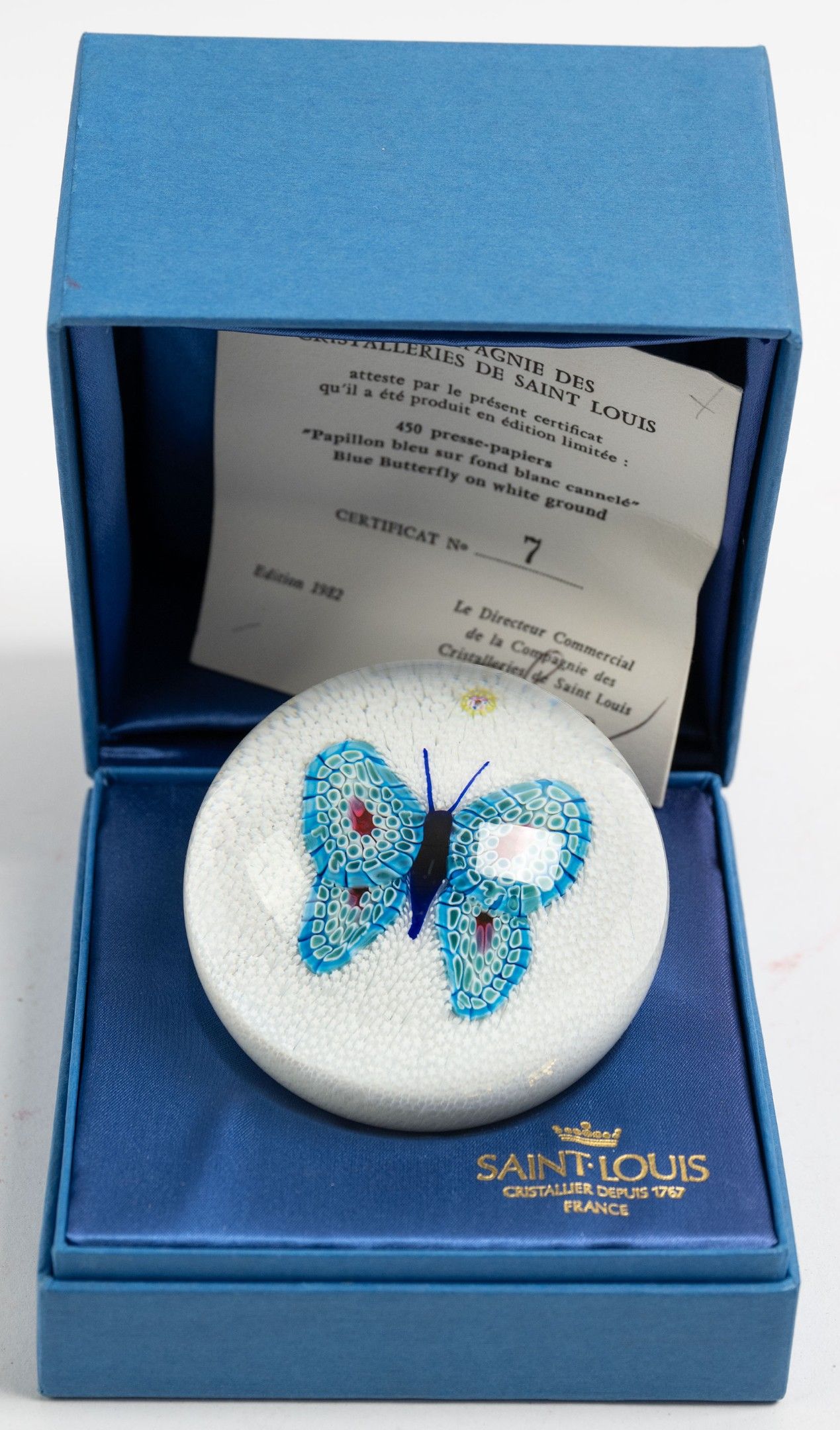 SAINT LOUIS, crystal paperweight, blue butterfly on white fluted background, 1982, justified 7/450, in box with certificate